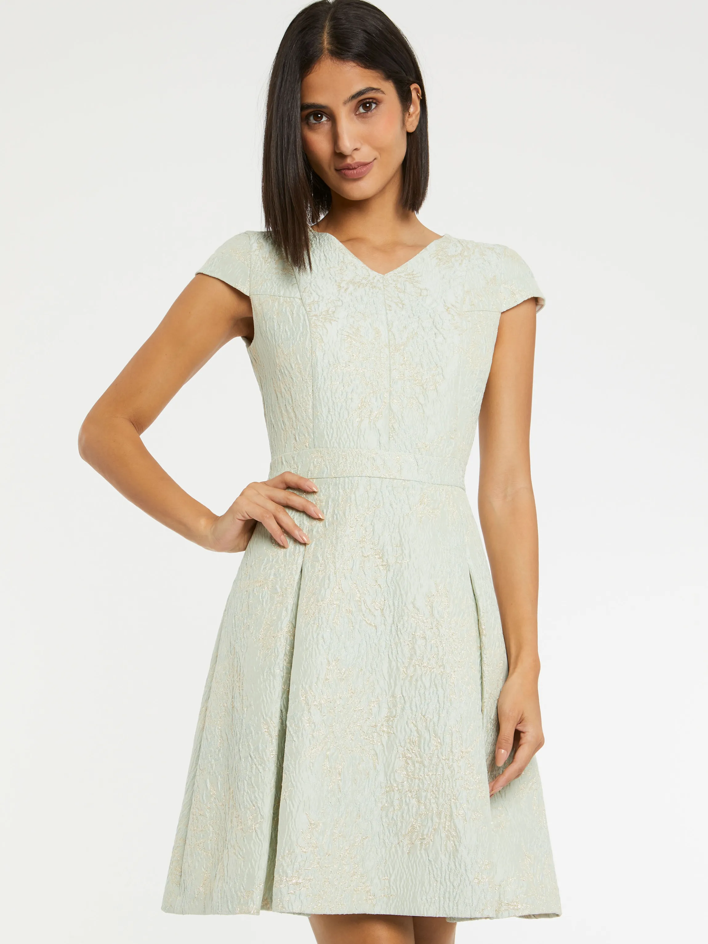 -Robe Courte Et Evasee En Jacquard Reliefe-Ceintree A La Taille-Manches Courtes-Col Legerement En V-Fermeture Eclair Inv…