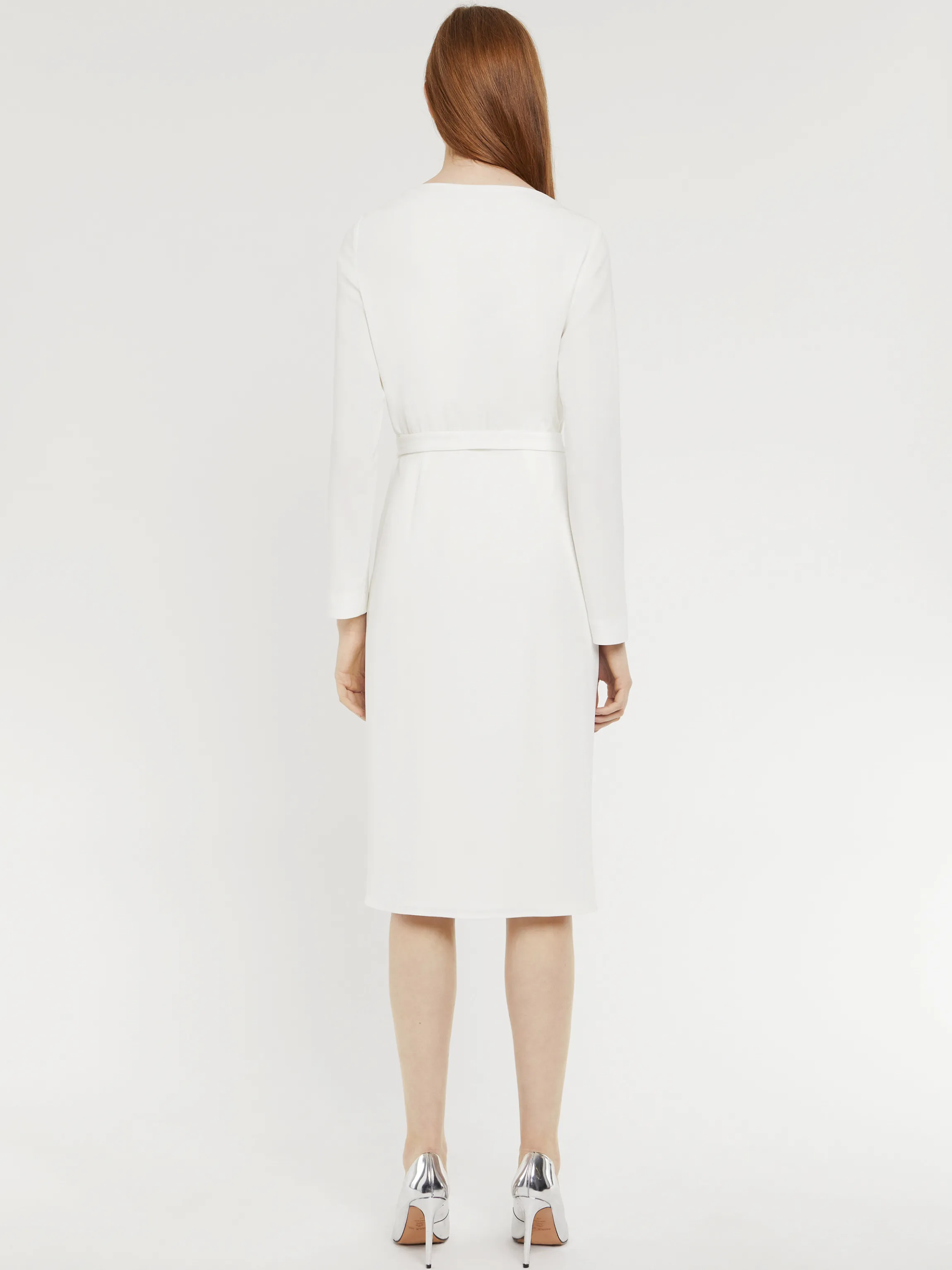 La Robe Droite Mi-Longue A Manches Longues Est En Crepe Envers Satin. Sa Coupe Pres Du Corps Est Ceinturee A La Taille P…