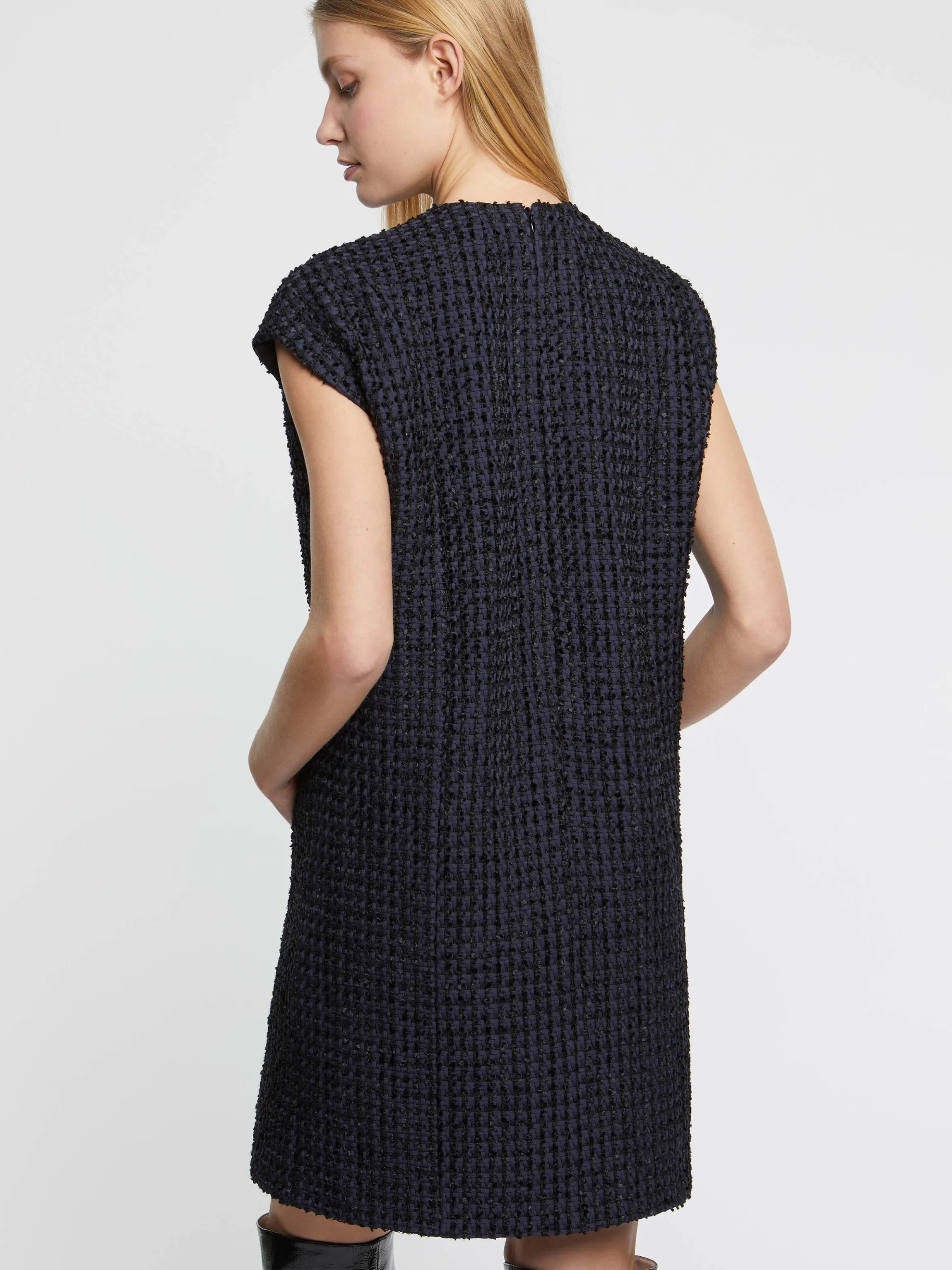 La Robe Sans Manches A Col V Troque Son Cote Sage Contre Une Coupe Destructuree, Moderne Et Hyper Tendance. Impertinente Et Audacieuse, Elle Est Confectionnee En Tweed Ruban Qui Apporte Un Joli Jeu De Lumiere Et De Brillance Naturelles Au Vetement. Un Ruban Gros Grain Vient Souligner L’Entree Des Poches. Fermeture Eclair Invisible Dans Le Dos. Longueur De La Robe A Partir De La Taille : 55 Cm.