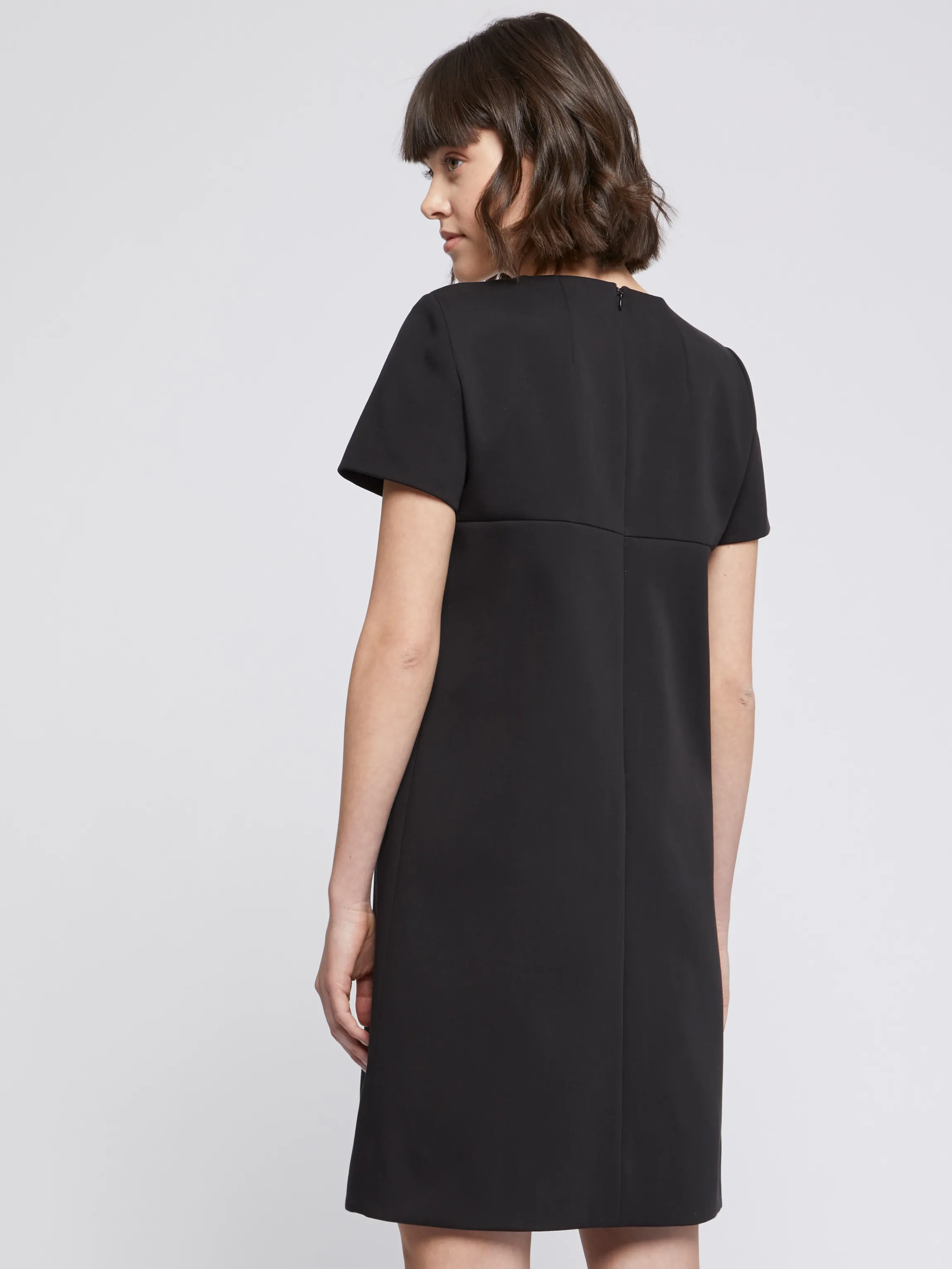 La Robe Courte Trapeze Est Dotee De Manches Courtes Et D?Un Petit Col Rond. La Robe Tricolore En Gabardine De Coton Tres Elastique Se Dessine Dans Une Coupe Graphique Structuree Par Une Grande Poche Plaquee Et Une Large Bande Qui Descend Depuis L’Epaule Jusque Dans Le Bas Ou Elle Vient Border La Moitie Du Vetement. Fermeture Zippee Invisible A L’Arriere. Longueur 55Cm.
