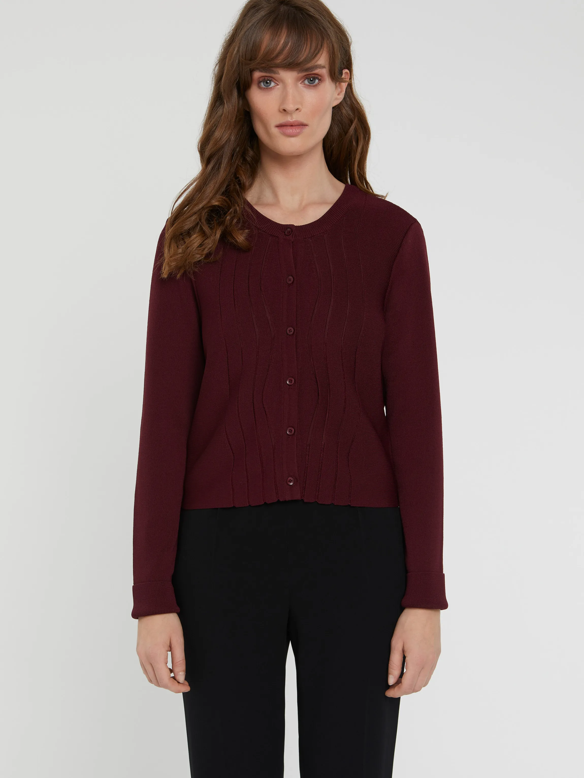 Le Gilet En Maille De Viscose Et Nylon Se Porte Court. Sa Ligne Minimale A Col Rond Est Contrastee Par La Brillance Naturelle De La Matiere Et Le Jeu De Vagues Cotelees Qui Anime Le Devant Du Modele.