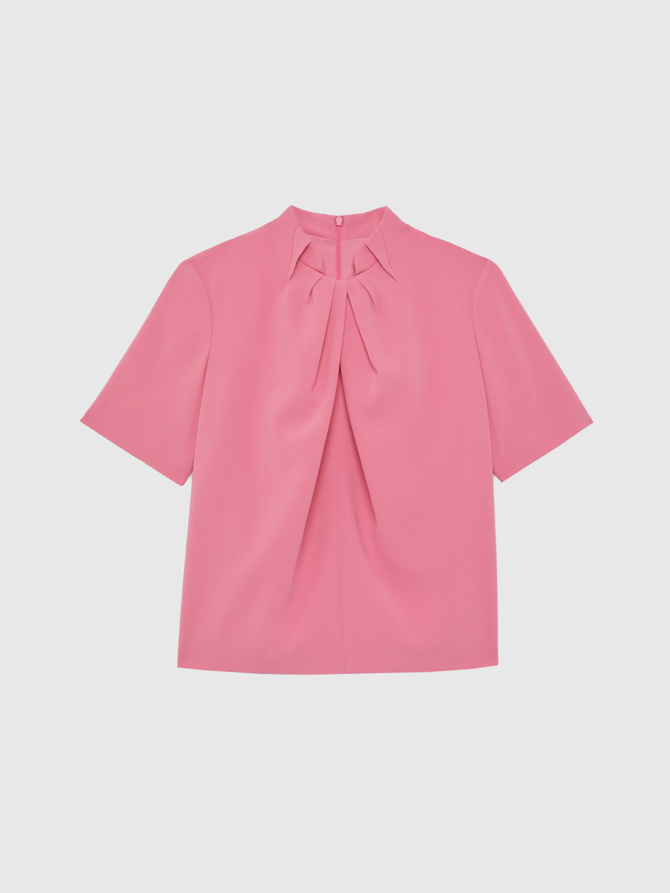 Le Haut Fluide En Crepe Envers Satin Arbore Des Manches 3/4. Il Est Dote D’Un Petit Col Montant Plisse Qui Diffuse Une Aura Sage, Presque Strict. Depuis L’Encolure, Un Large Pli Creux S’Esquisse Sur La Poitrine Et Apporte Un Joli Mouvement Fluide Au Top. Fermeture Eclair Invisible Au Dos.