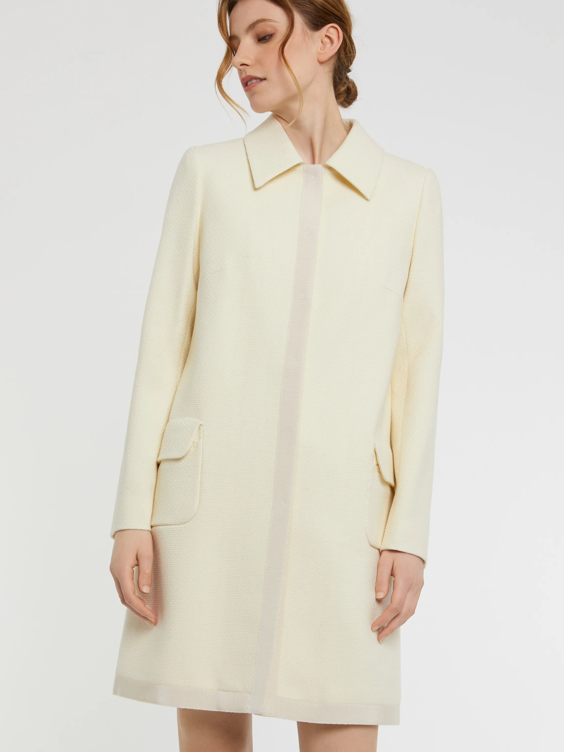 A Chaque Occasion, Son Manteau. Ici, Le Manteau D’Hiver Fait Partie Des Pieces Fortes De Votre Vestiaire D’Exception. Mi-Long, La Confection En Laine Faconnee Apporte Un Relief Subtil Et Raffine Au Modele. Sa Coupe Droite Legerement Evasee Est Ornee D’Un Petit Col Et De Poches Plaquees Tandis Qu’Un Ruban Gros Grain Souligne La Patte De Fermeture A Pressions Invisibles Et Ainsi Que Le Bas Du Modele. L?Eloge De L’Elegante Simplicite.
