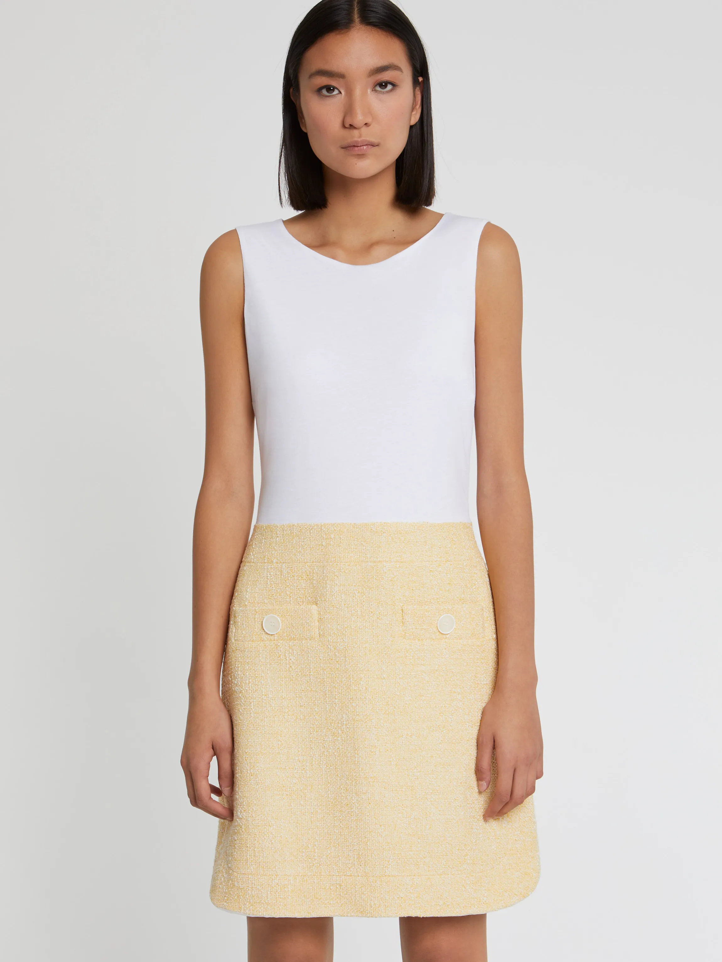 La Robe Printaniere Se Dessine Dans Un Look Trompe-L’Oeil En Bi-Matiere. Le Haut Sans Manches Pres Du Corps Est En Jersey De Coton Et Semble Rentre Dans Une Mini-Jupe En Tweed Structure Par Une Ceinture Plate. Deux Fausses Poches A Gros Boutons Peaufinent L’Esprit Sixties Du Vetement. La Longueur De La Robe A Partir De La Taille Est De 50 Cm.