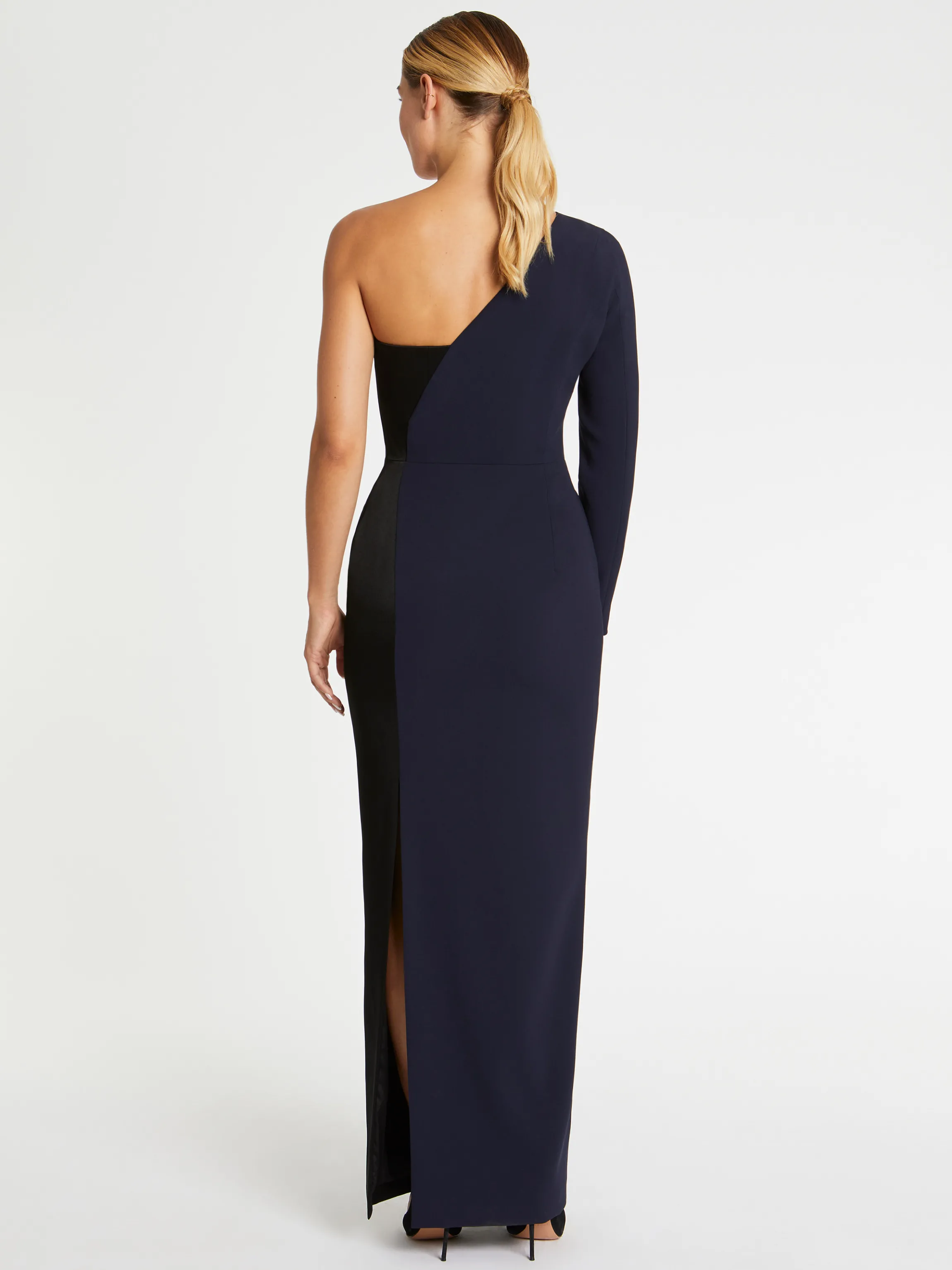 Sur La Robe Longue De Ceremonie, Le Tissu Crepe De Satin Affiche Son Fini Mat Et Son Cote Naturellement Brillant Au Detour D’Une Courbe Graphique. Tour A Tour Bustier Et Manche Longue, La Robe Asymetrique Fendue Sur Le Cote Maitrise Les Oppositions Et Offre Un Modele Couture, Hautement Seduisant. Longueur De La Robe A Partir De La Taille : 115 Cm.