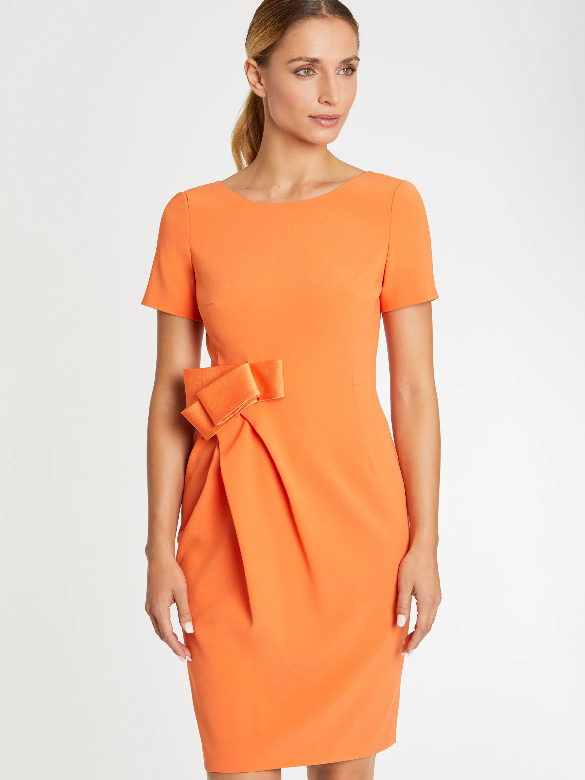 La Robe Du Soir A Manches Courtes En Crepe Envers Satin Arbore Une Coupe Droite Mi-Longue Qui Ne Manque Pas De Charme. Sa Ligne Essentielle Resolument Feminine Est Sublimee Par Un Decollete Largement Degage Dans Le Dos Tandis Que Devant, Un Gros Noeud Couture Vient S’Accrocher A La Taille Dans Un Joli Mouvement Drape. Les Grands Classiques Prennent De L’Envergure. Fermeture Eclair Invisible Dans Le Dos. Longueur De La Robe A Partir De La Taille : 60 Cm.