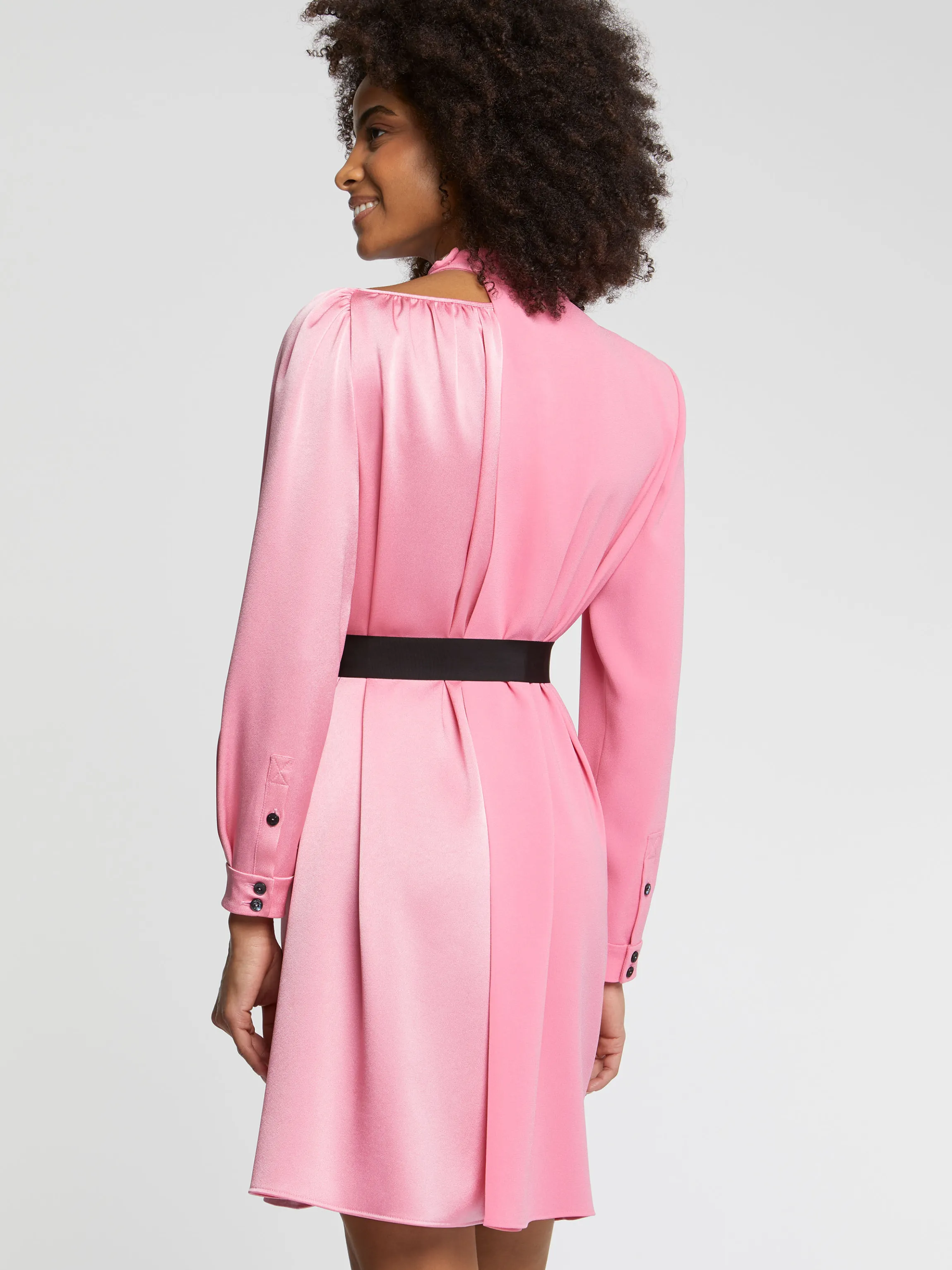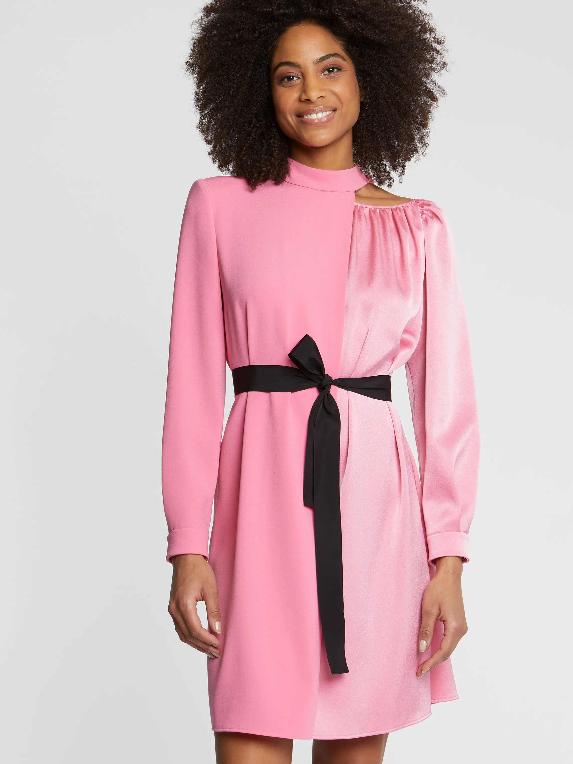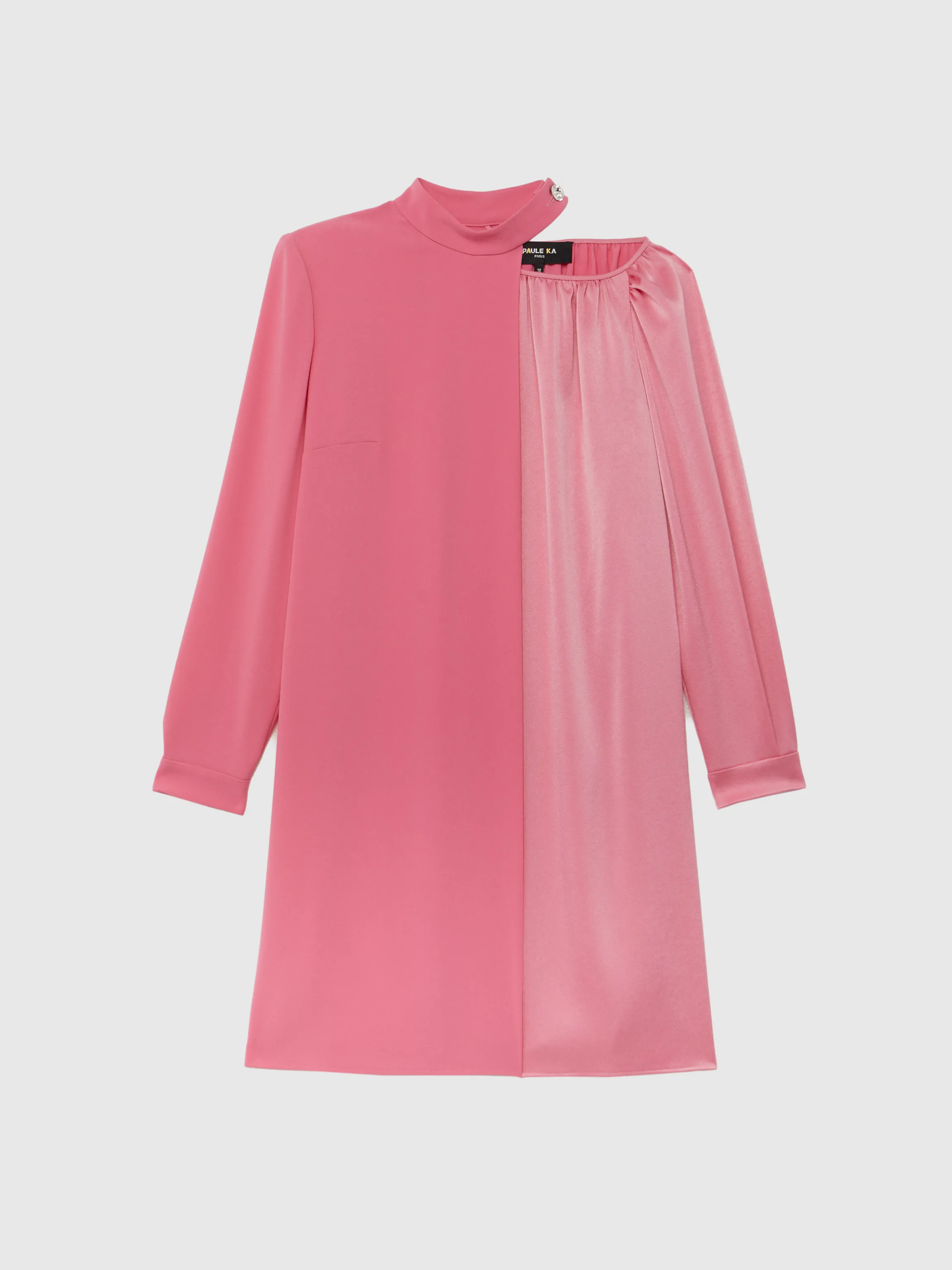 La Robe Courte En Crepe De Satin Prend Forme Dans Une Version Originale. Un Cote Mat, Un Cote Brillant ; Un Cote Structu…