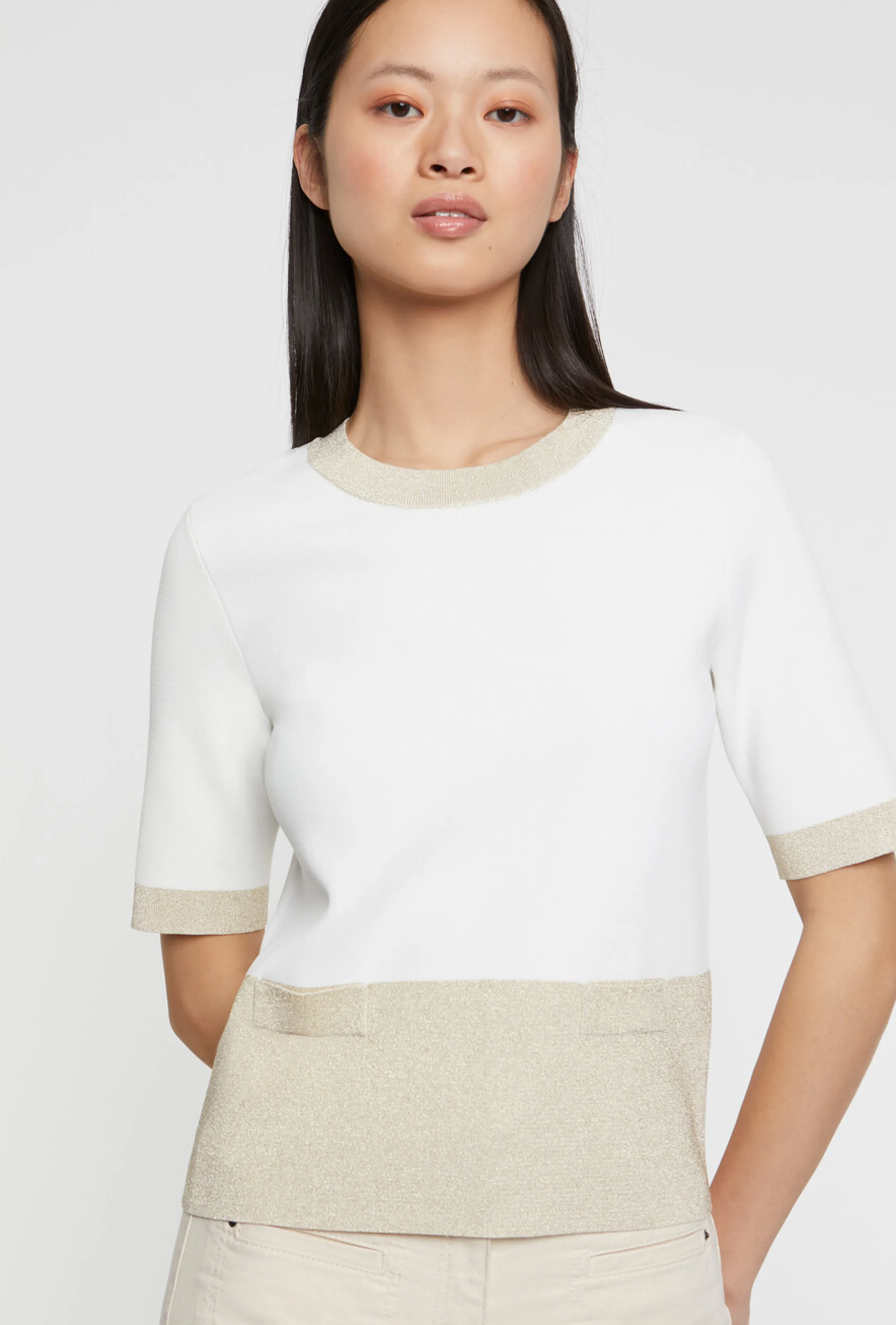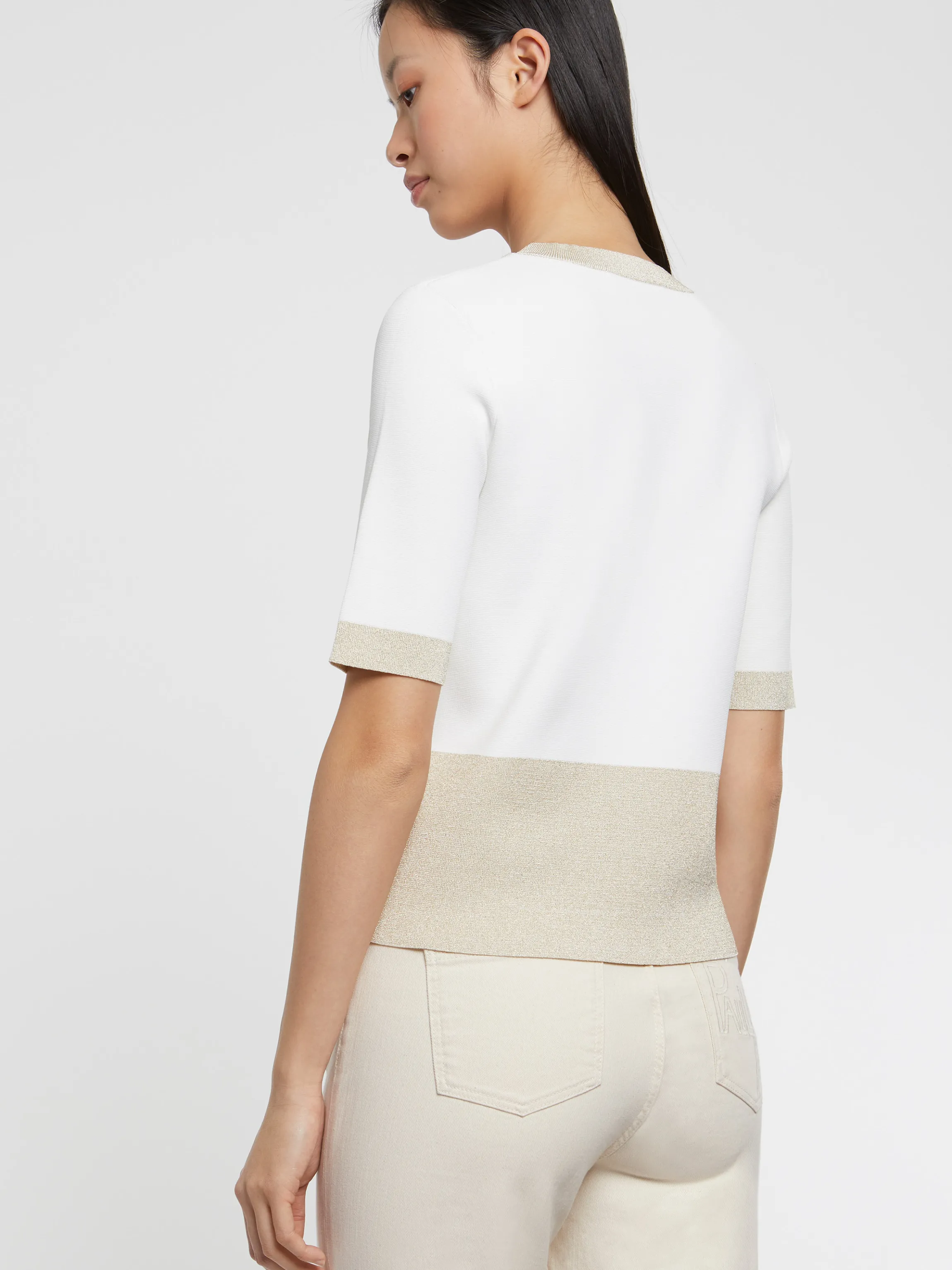 Le Pull En Viscose Milano Offre Un Porter Structure, Confortable Et Pres Du Corps. Le Tissu Legerement Brillant Est Sublime Par L’Apport De Lurex Au Col Rond, En Bas Des Manches Courtes Et Du Vetement ; Tandis Que Les Boutons Bijou Dores Embourgeoisent Le Petit Pull Mi-Saison. La Resultante : Un Piece Forte Et Feminine Qui S’Empare Des Codes Bcbg Avec Talent.