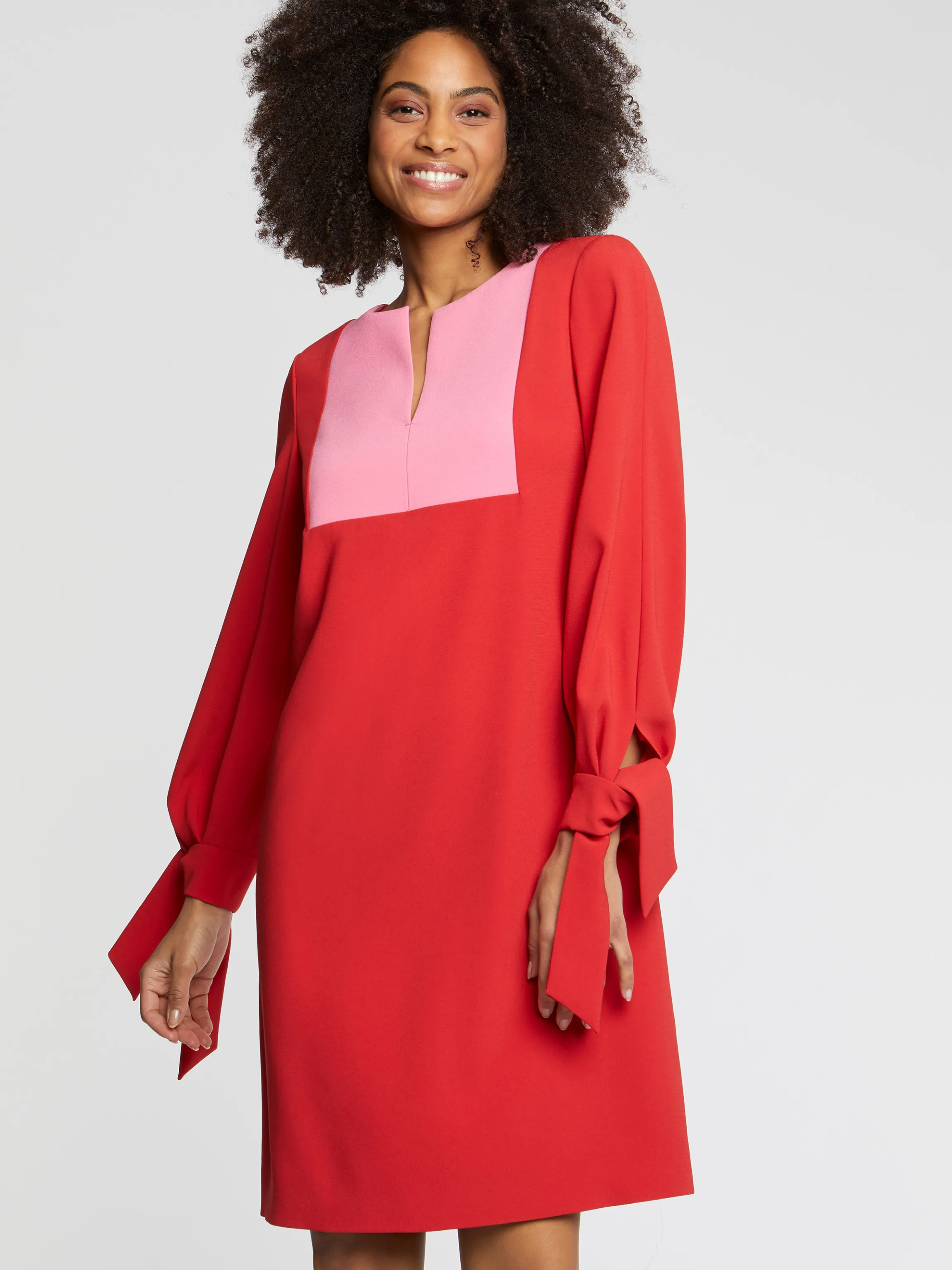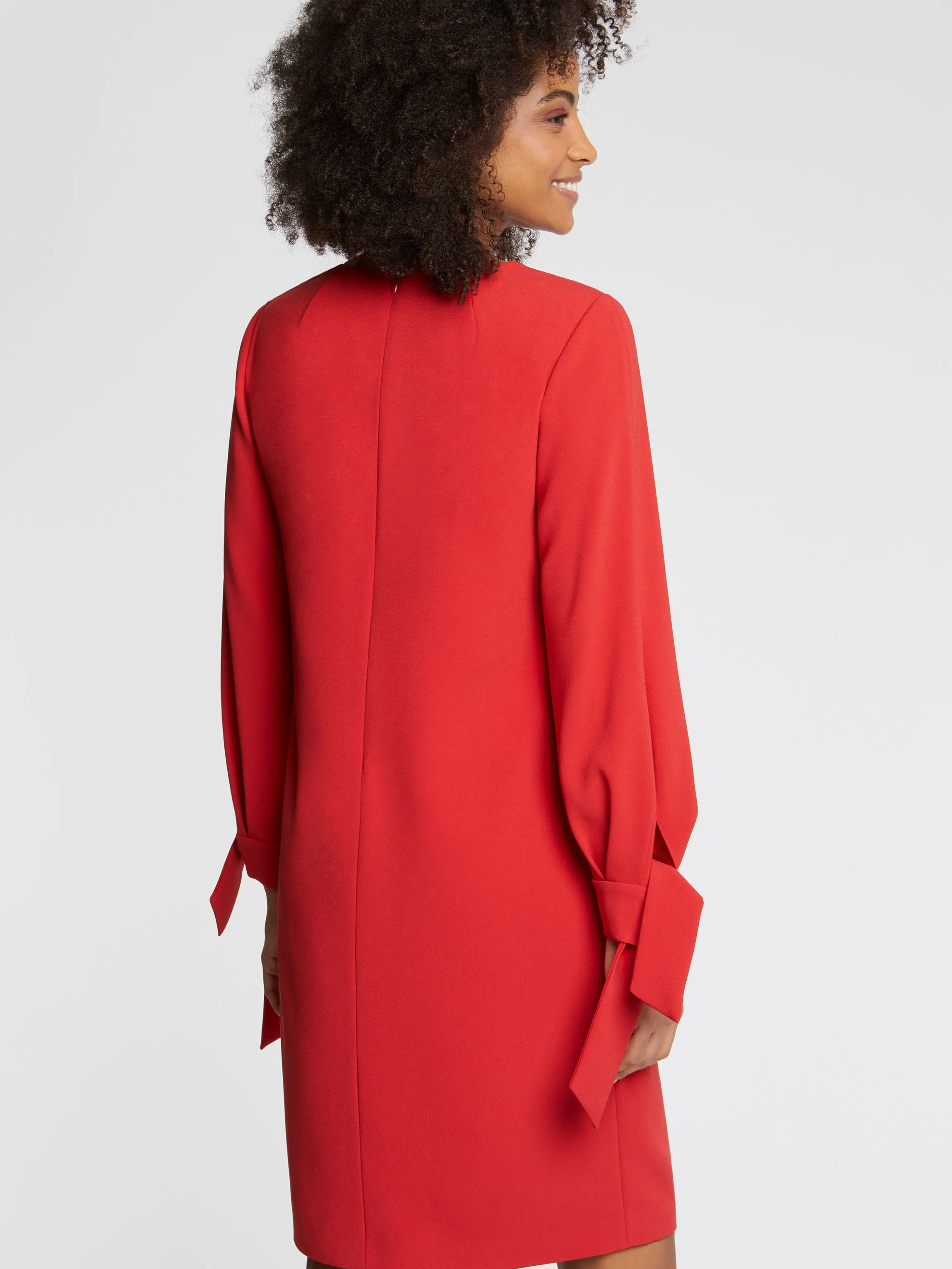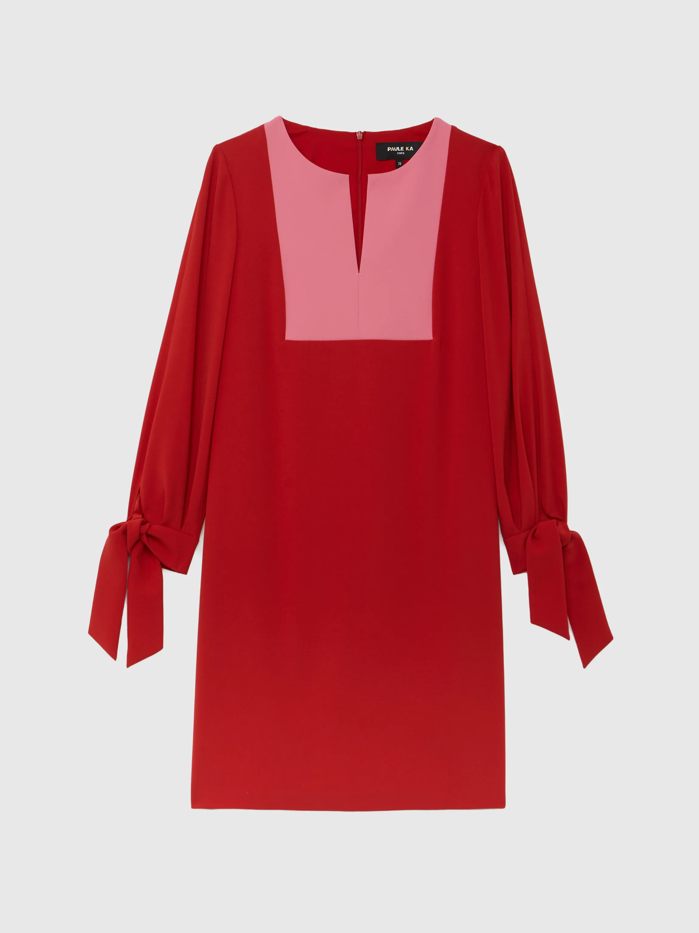 La Robe Courte En Crepe Envers Satin Prend Forme Sur Le Cote Mat De La Matiere. Elle Se Dessine Dans Une Coupe Courte Legerement Trapeze Et Arbore Des Manches Longues Ornees De Gros Noeuds Aux Poignets. Devant, Le Plastron Au Coloris Contraste Est Dote D’Un Decollete Fendu Qui Confere Un Caractere Graphique Au Vetement. Fermeture Eclair Invisible Au Dos. Longueur De La Robe A Partir De La Taille : 55 Cm