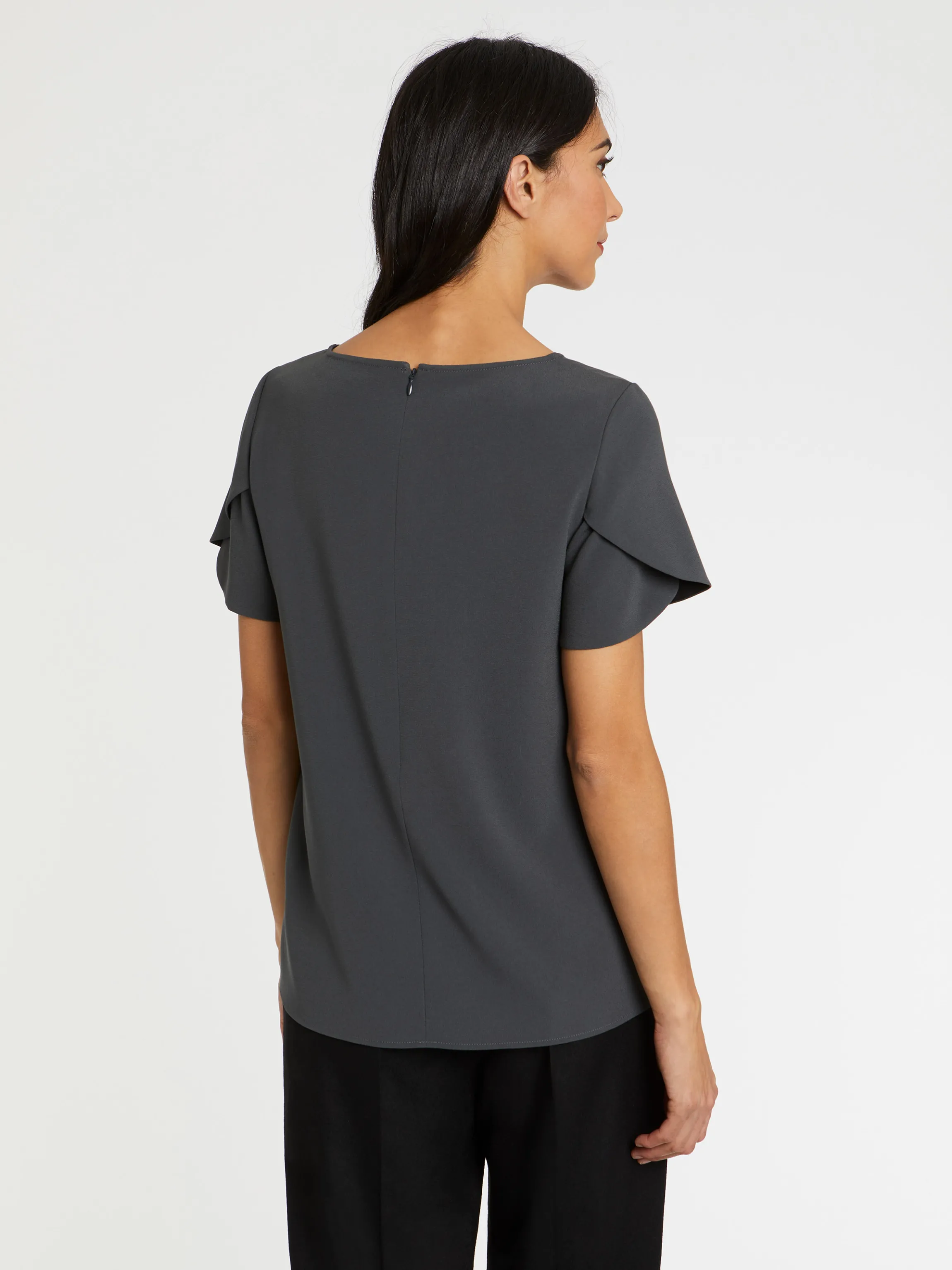 Le Top Manches Courtes Prend Forme Dans Une Coupe Fluide Legerement Evasee Dotee D’Une Encolure Degagee. Les Manches Courtes Sont Ornees De Decoupes Arrondies Juxtaposees Qui Apportent Un Mouvement Leger Au Vetement En Tissu Crepe. Il Est Le Trait D’Union Parfait Entre Elegance Et Simplicite. Le Vetement Se Ferme Dans Le Dos A L’Aide D’Une Fermeture Eclair.