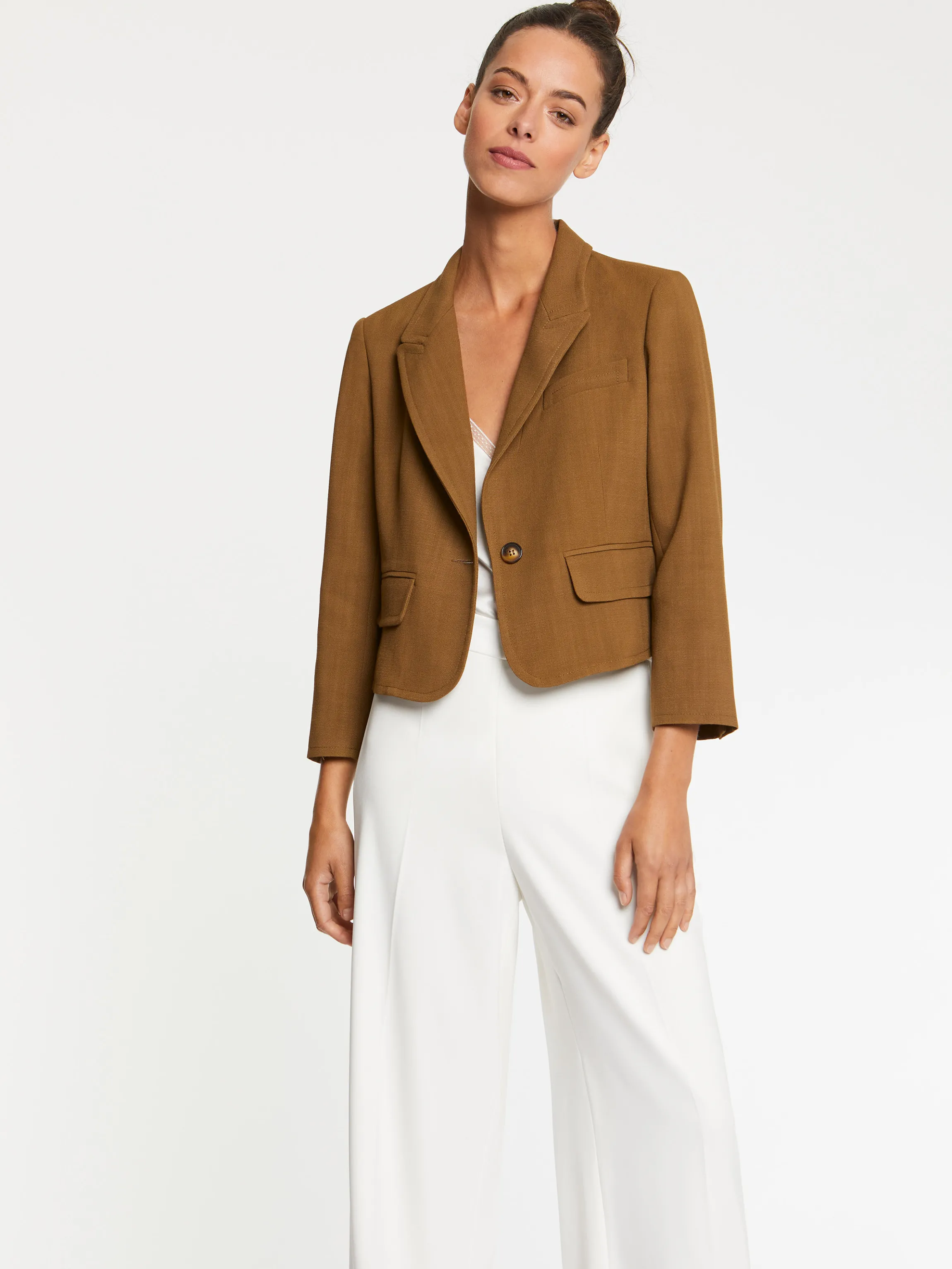 La Veste De Tailleur S’Exprime Dans Un Registre Estival. Confectionnee En Toile De Viscose Fluide Et Structuree Par Une Coupe Courte A Hauteur De Taille, La Veste De Femme Fermee Par Un Bouton Et Dotee De Poches A Rabat Et Sur La Poitrine, Transcende Vos Silhouettes Citadines Printanieres.