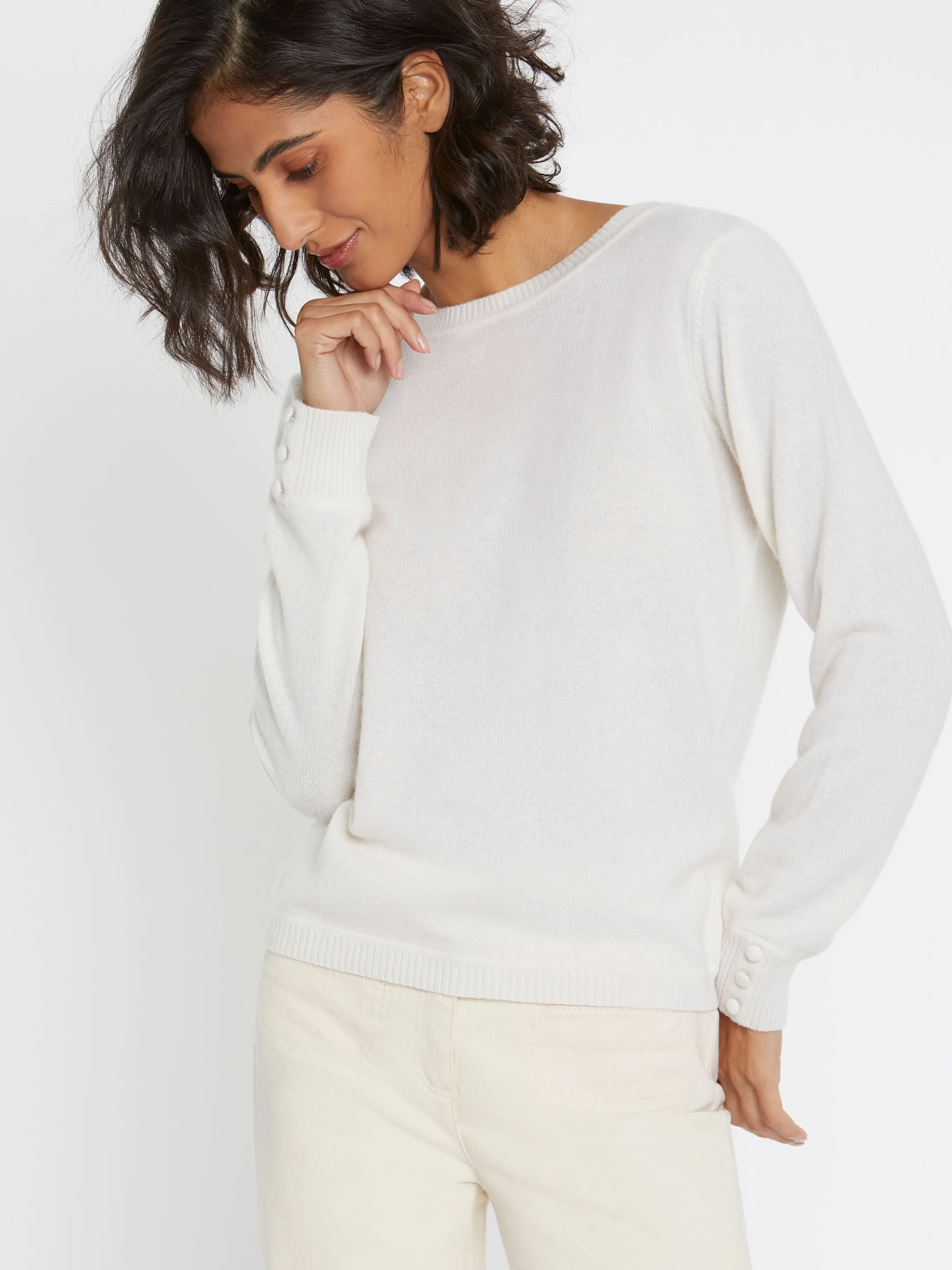 Piece Forte De L’Hiver, Le Pull En Cachemire Se Choisit Dans Toutes Les Coupes Et Tous Les Coloris. Cet Hiver, Sa Ligne Essentielle Droite A Col Rond Structuree Par Des Bords-Cotes Revele Un Petit Cote Espiegle Resolument Enviable. Dans Le Dos, Sous Le Bord De L?Encolure, Une Decoupe En V Laisse Apparaitre Votre Peau En Douceur. Quand L’Ultra Feminite S’Exprime Au Detour D’Un Classique.