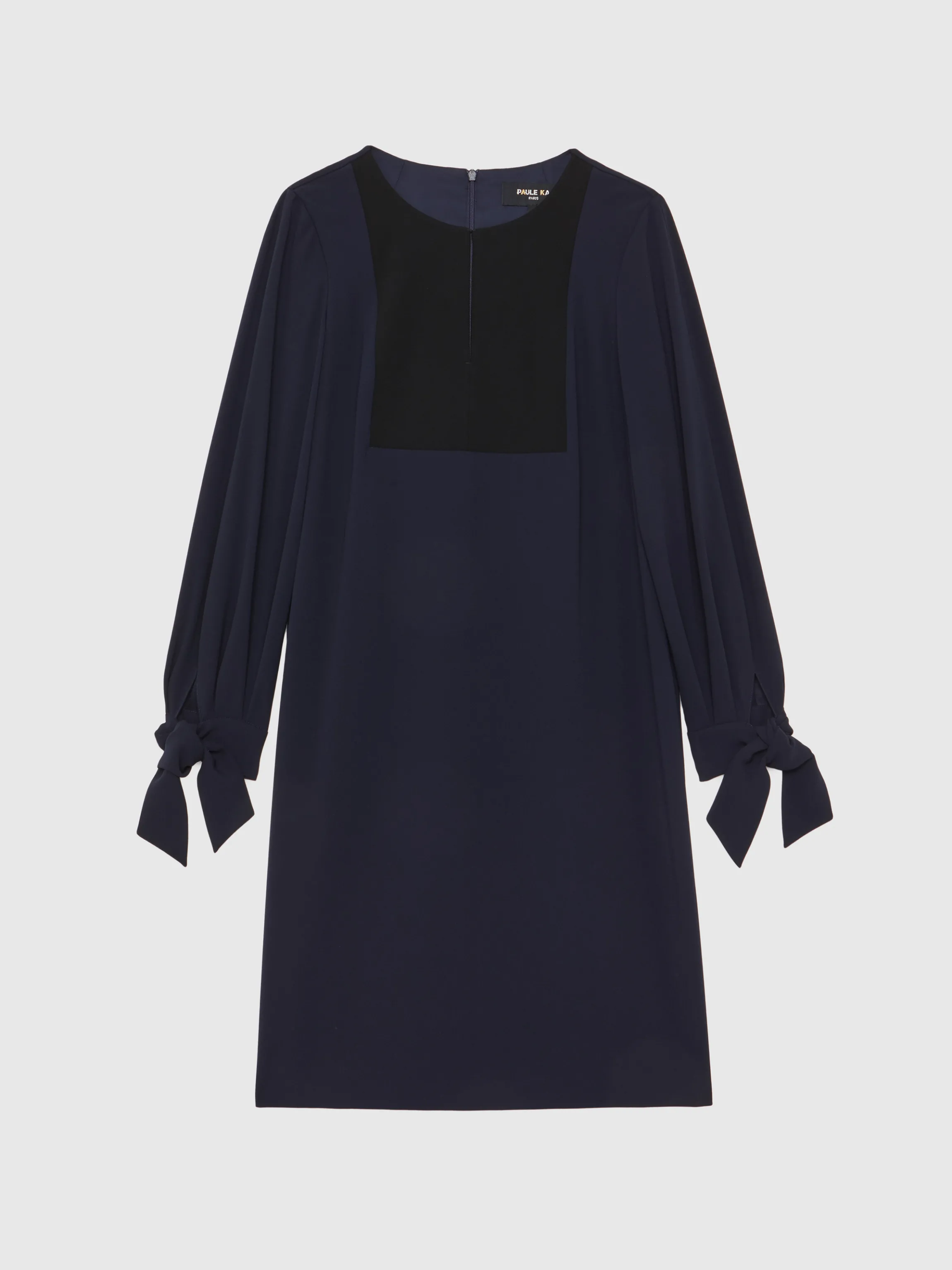 La Robe Courte En Crepe Envers Satin Prend Forme Sur Le Cote Mat De La Matiere. Elle Se Dessine Dans Une Coupe Courte Legerement Trapeze Et Arbore Des Manches Longues Ornees De Gros Noeuds Aux Poignets. Devant, Le Plastron Au Coloris Contraste Est Dote D’Un Decollete Fendu Qui Confere Un Caractere Graphique Au Vetement. Fermeture Eclair Invisible Au Dos. Longueur De La Robe A Partir De La Taille : 55 Cm