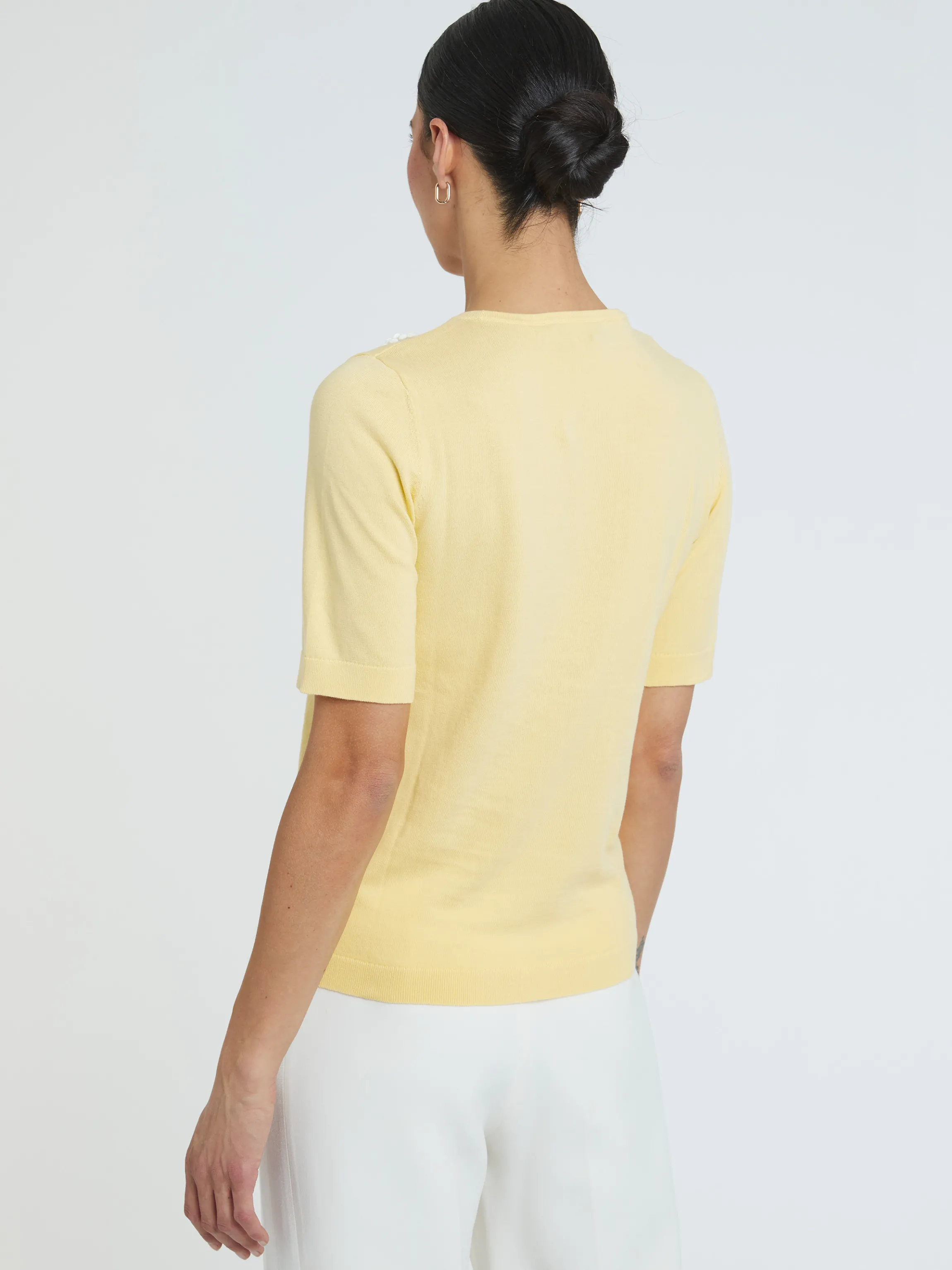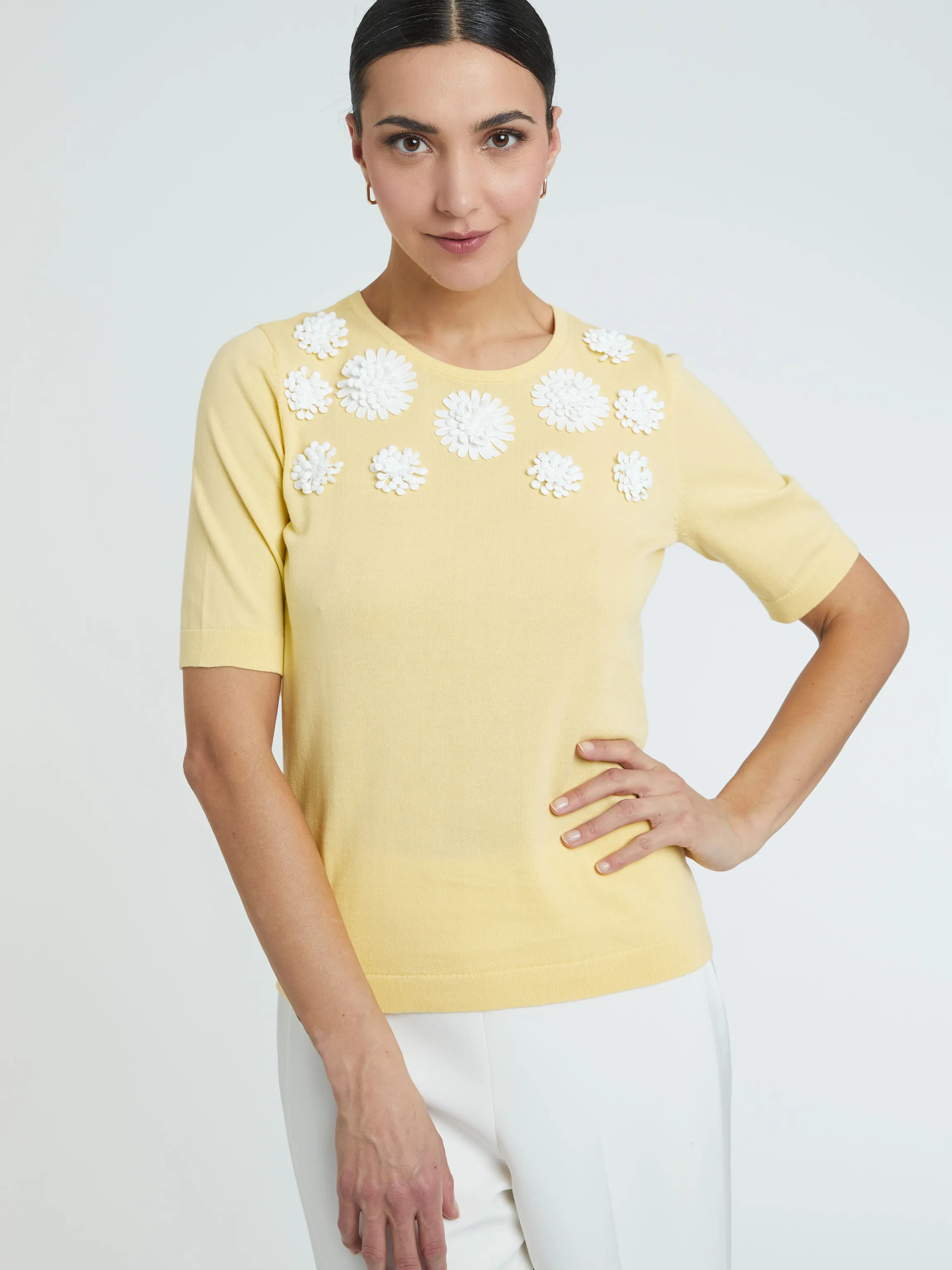 -Pull En Coton-Col Rond-Manches Longues-Broderies Florales Blanches Ornant Le Haut