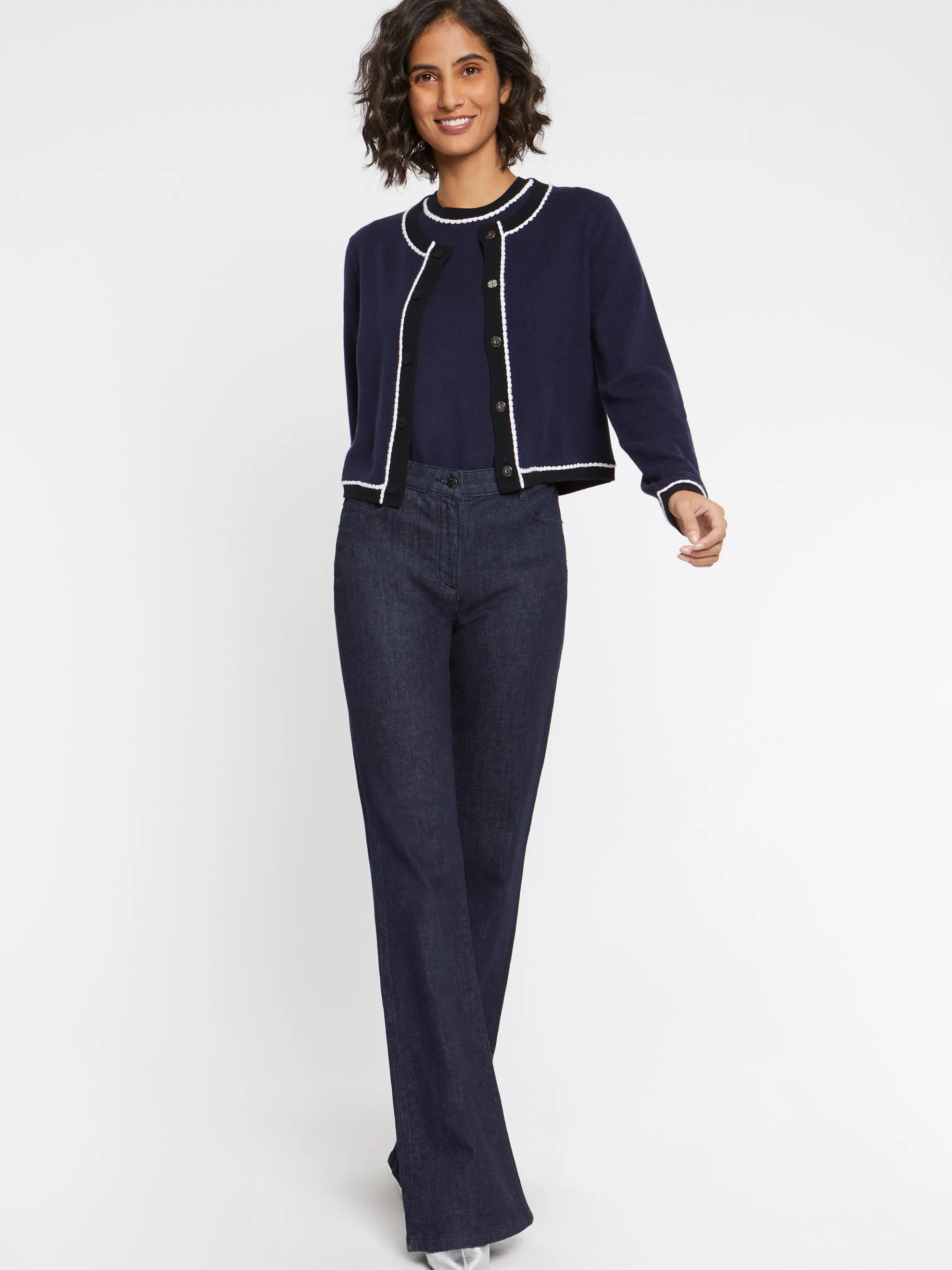 Le Pull En Laine Et Cachemire Fin Prend Forme Dans Une Coupe Manches Courtes A Col Rond. L’Encolure Et Les Bas De Manches Sont Soulignes De Bords-Cotes Et De Festons Contrastes. Un Detail Ravissant Qui Apporte Une Note Preppy A Votre Style. Un Petit Tresor Du Vestiaire Bcbg.