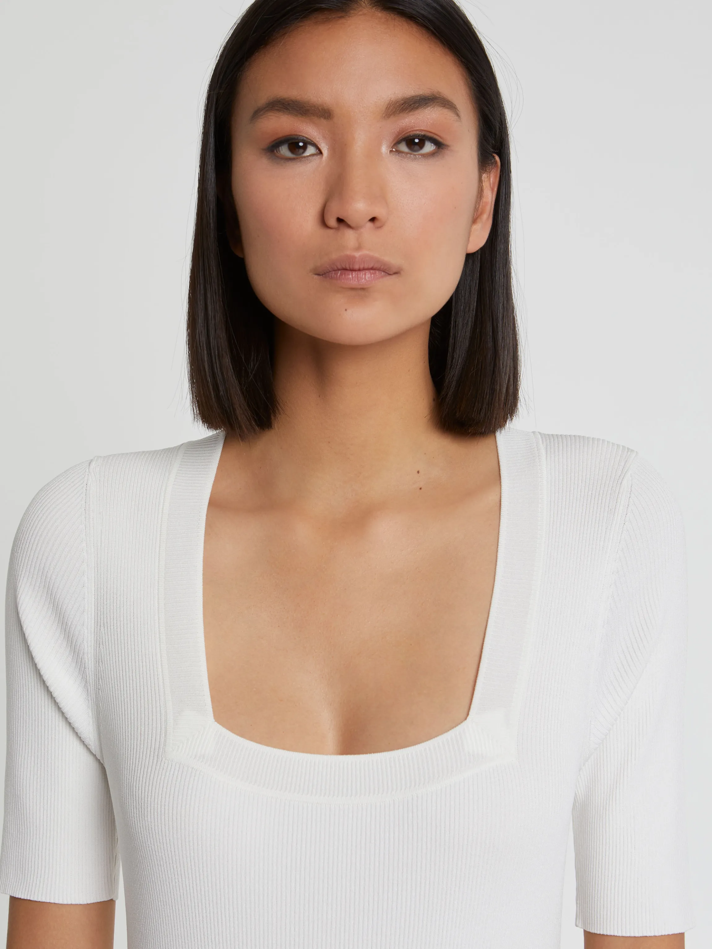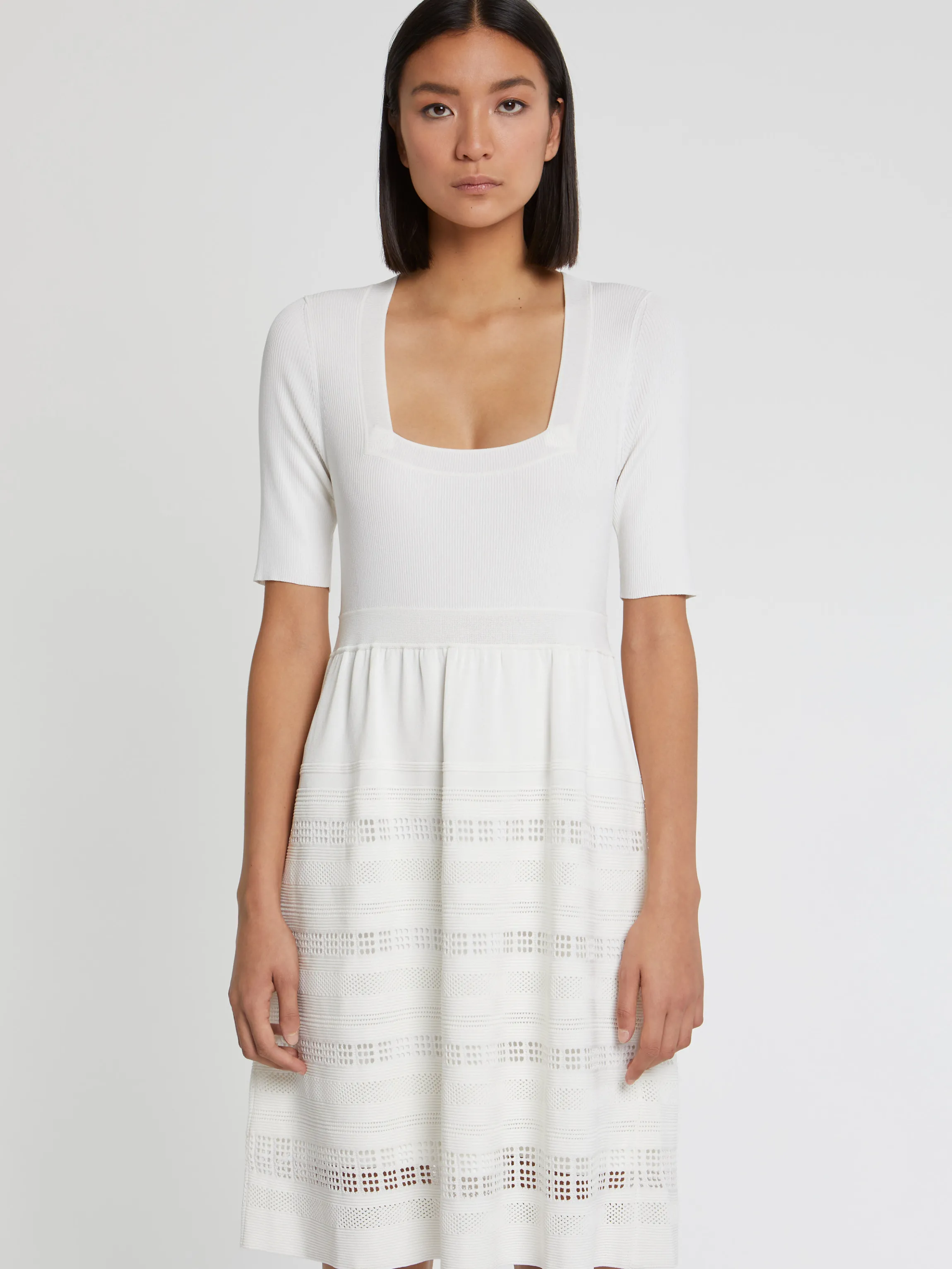 La Robe Manches Courtes Se Dessine Dans Une Coupe Patineuse. Le Haut Pres Du Corps Sculpte La Silhouette Tandis Que La Jupe Evasee Revele Une Allure Mutine Irresistible. Imaginee En Maille De Viscose Fantaisie, La Robe Est Rythmee De Bandes Ajourees Dans Le Bas Du Vetement. Le Tres Tendance Decollete Carre Apporte Un Charme Vintage Au Modele. Longueur A Partir De La Taille : 55 Cm.