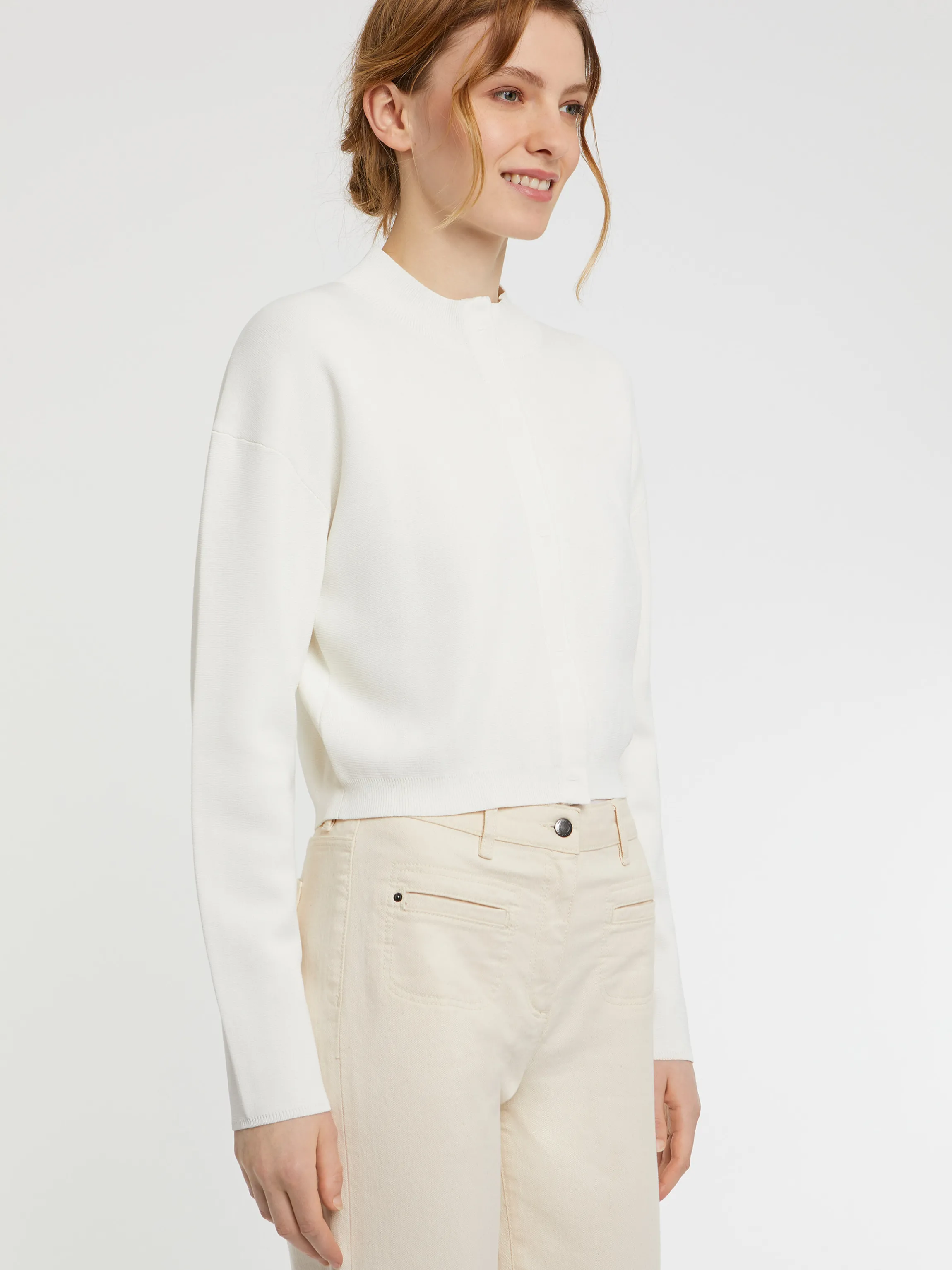 Le Cardigan Prend Forme Dans Une Coupe Epuree Dotee D’Un Petit Col Legerement Montant Et D’Une Patte De Fermeture A Pression Invisible. Il Est Confection En Viscose Milano Qui Confere Au Modele Un Aspect Brillant Et Un Toucher Doux Fluidifie Par La Viscose. Des Bords-Cotes Structurent Le Vetement.