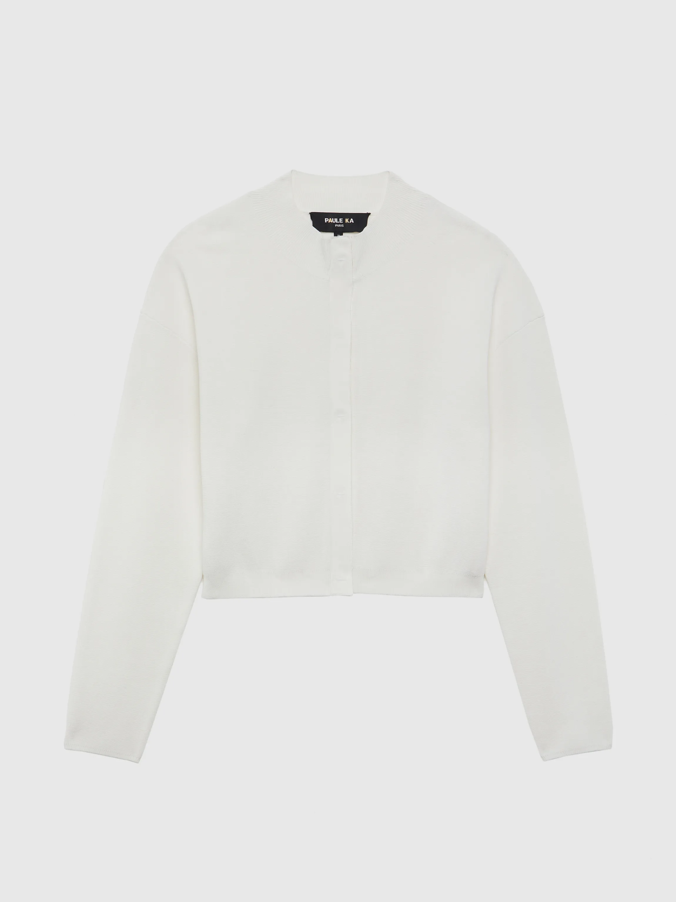 Le Cardigan Prend Forme Dans Une Coupe Epuree Dotee D’Un Petit Col Legerement Montant Et D’Une Patte De Fermeture A Pres…