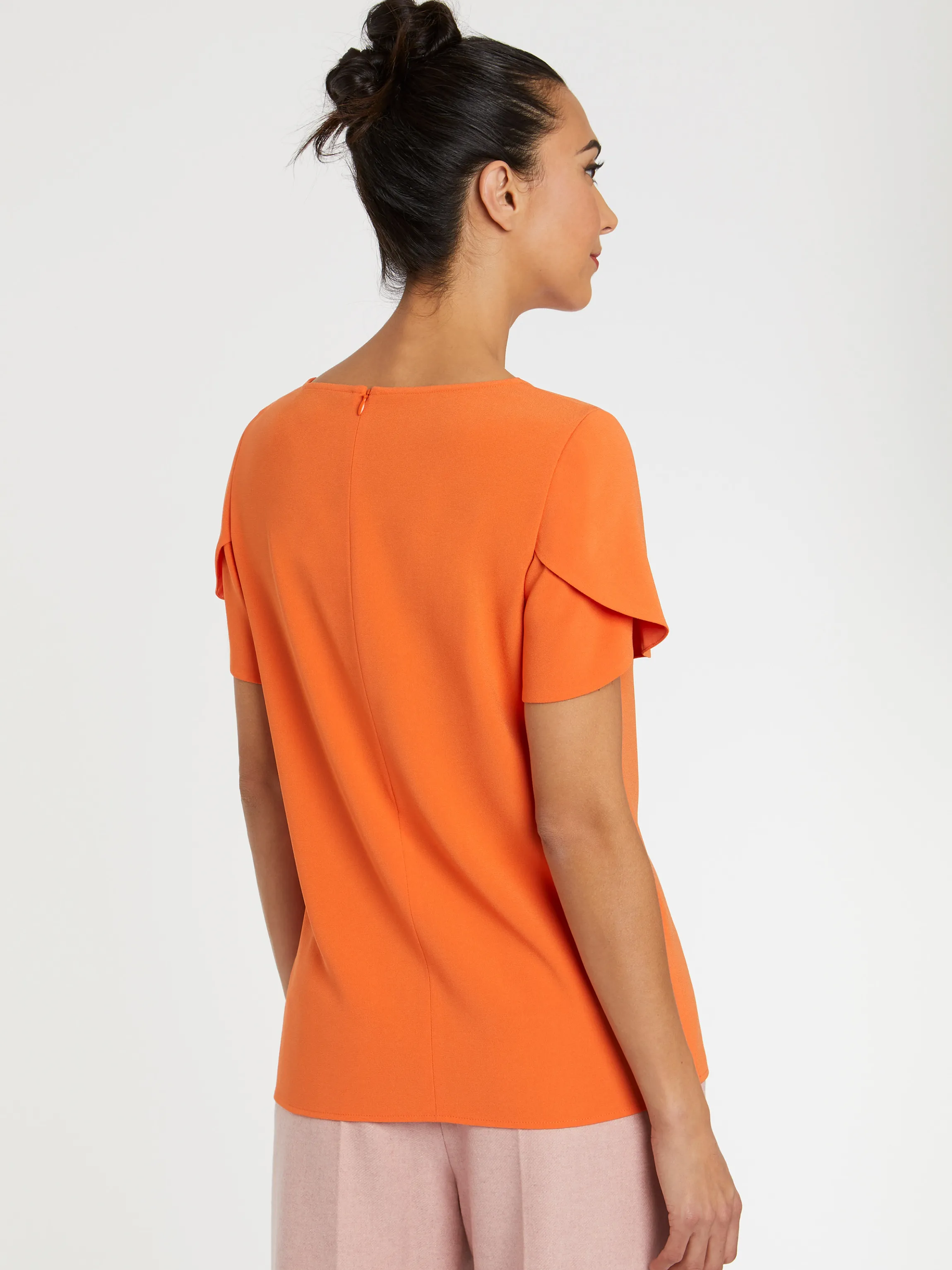 Le Top Manches Courtes Prend Forme Dans Une Coupe Fluide Legerement Evasee Dotee D’Une Encolure Degagee. Les Manches Courtes Sont Ornees De Decoupes Arrondies Juxtaposees Qui Apportent Un Mouvement Leger Au Vetement En Tissu Crepe. Il Est Le Trait D’Union Parfait Entre Elegance Et Simplicite. Le Vetement Se Ferme Dans Le Dos A L’Aide D’Une Fermeture Eclair.