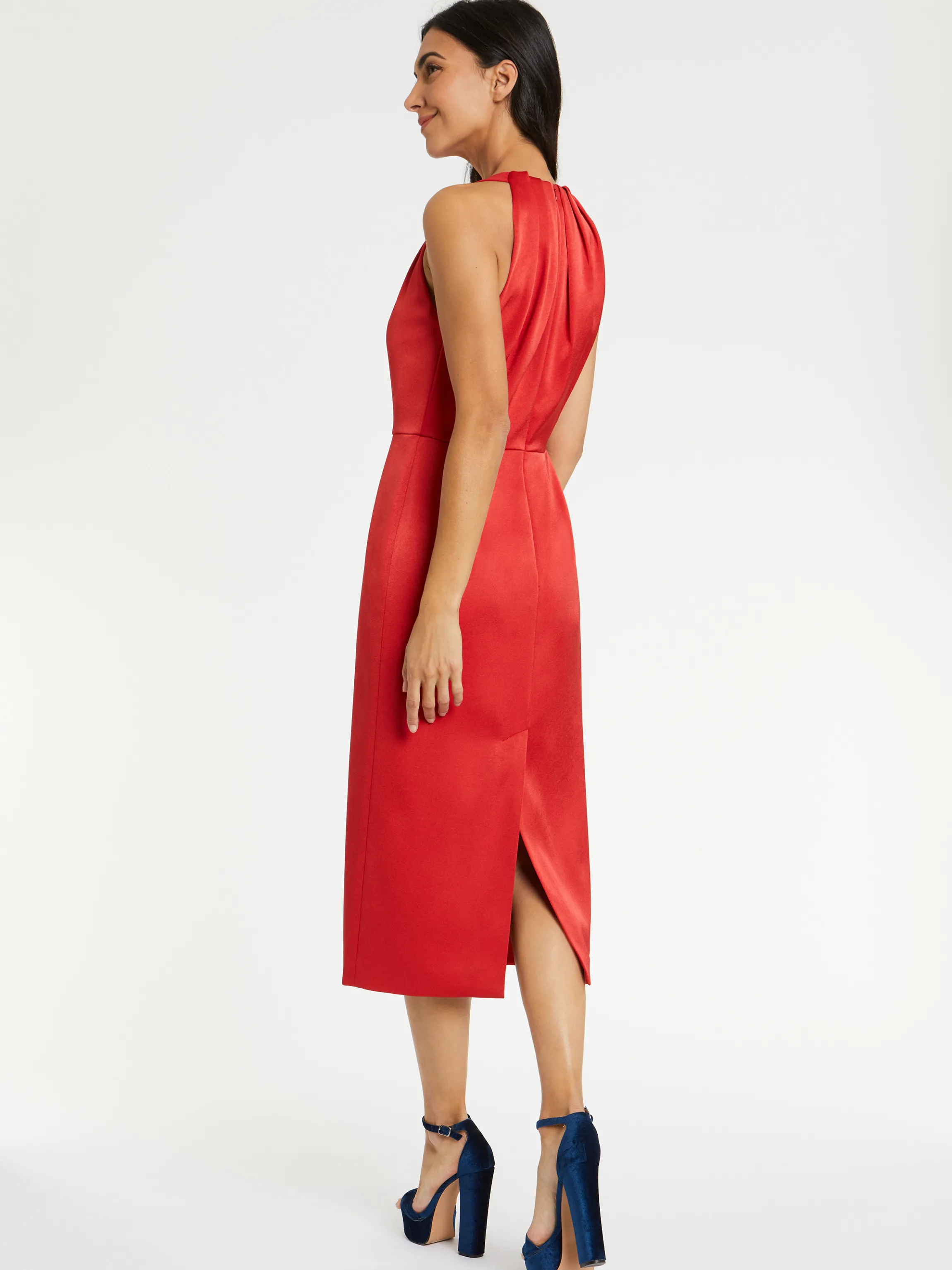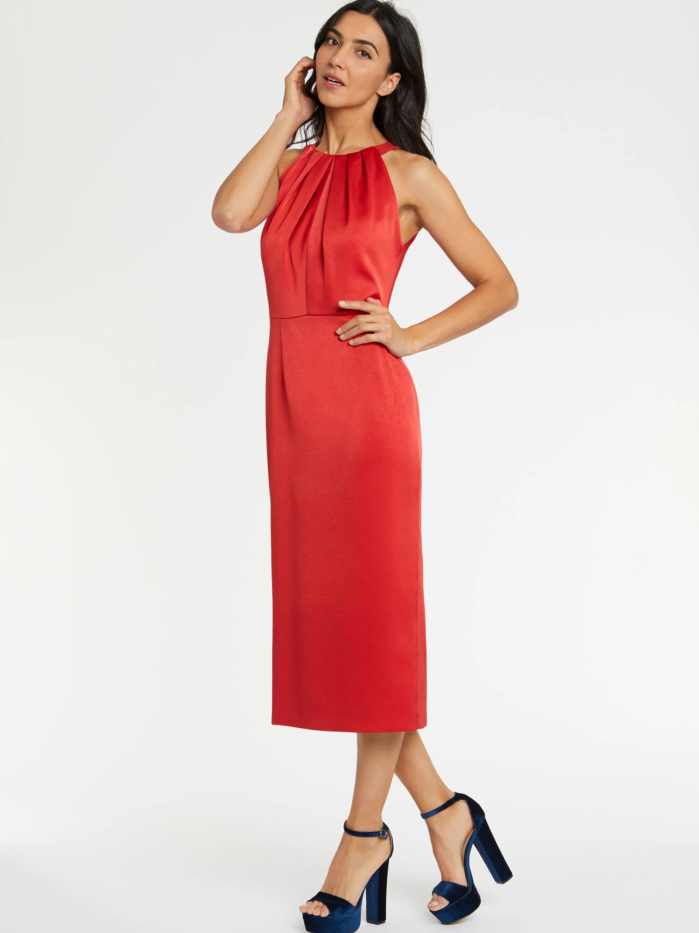Plus Desirable Que Jamais, La Robe De Ceremonie Se Dessine Sur Le Cote Naturellement Brillant Du Satin Crepe. Pres Du Corps Et Marquee A La Taille Haute, Elle Revele Vos Courbes Feminines, Tandis Que L’Encolure S’Esquisse Dans Un Superbe Eventail De Plis Plats Qui Galvanise La Silhouette. La Robe Qui Denude Des Epaules Retombe Sur Une Jupe Midi, Droite, Resolument Glamour.