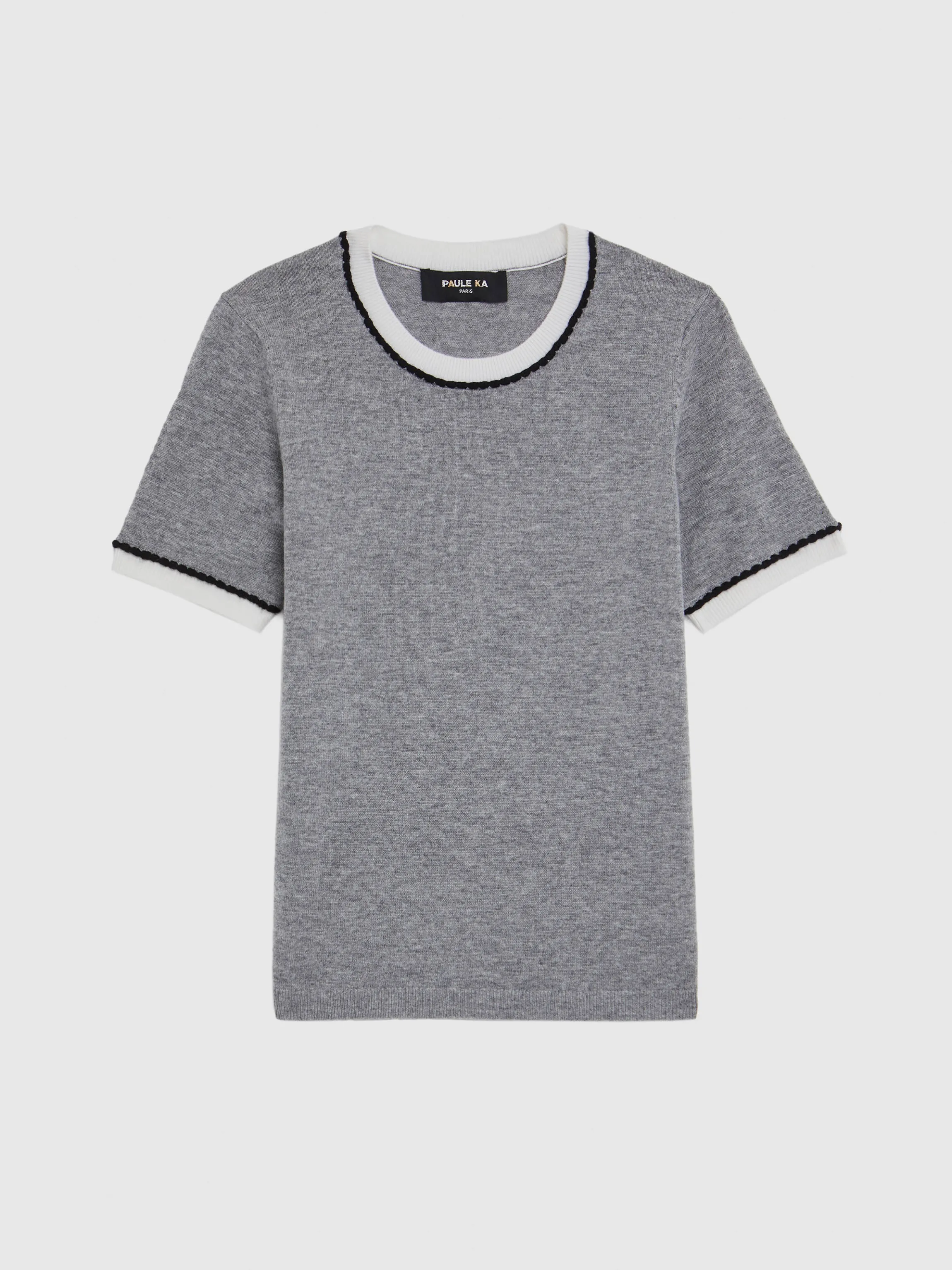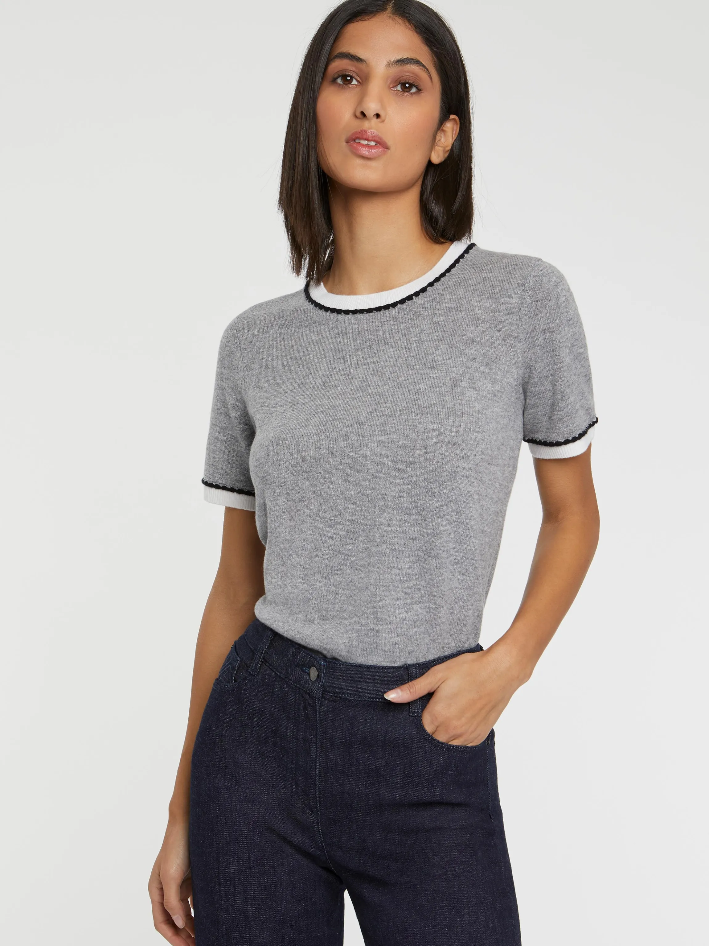 Le Pull En Laine Et Cachemire Fin Prend Forme Dans Une Coupe Manches Courtes A Col Rond. L’Encolure Et Les Bas De Manches Sont Soulignes De Bords-Cotes Et De Festons Contrastes. Un Detail Ravissant Qui Apporte Une Note Preppy A Votre Style. Un Petit Tresor Du Vestiaire Bcbg.