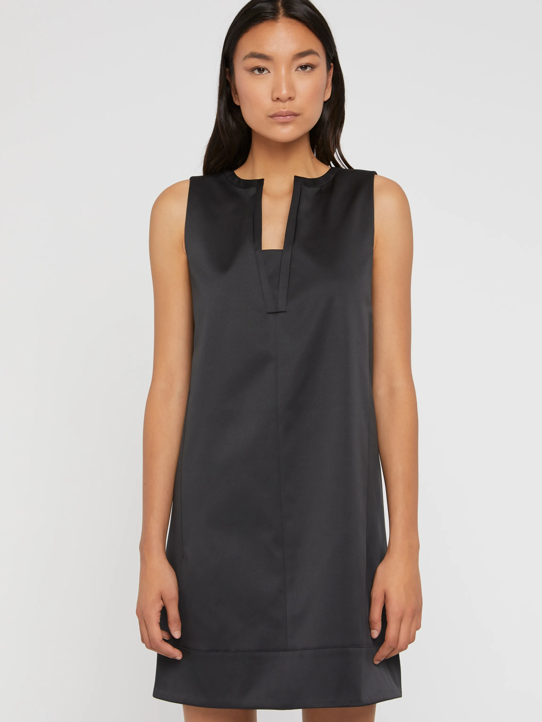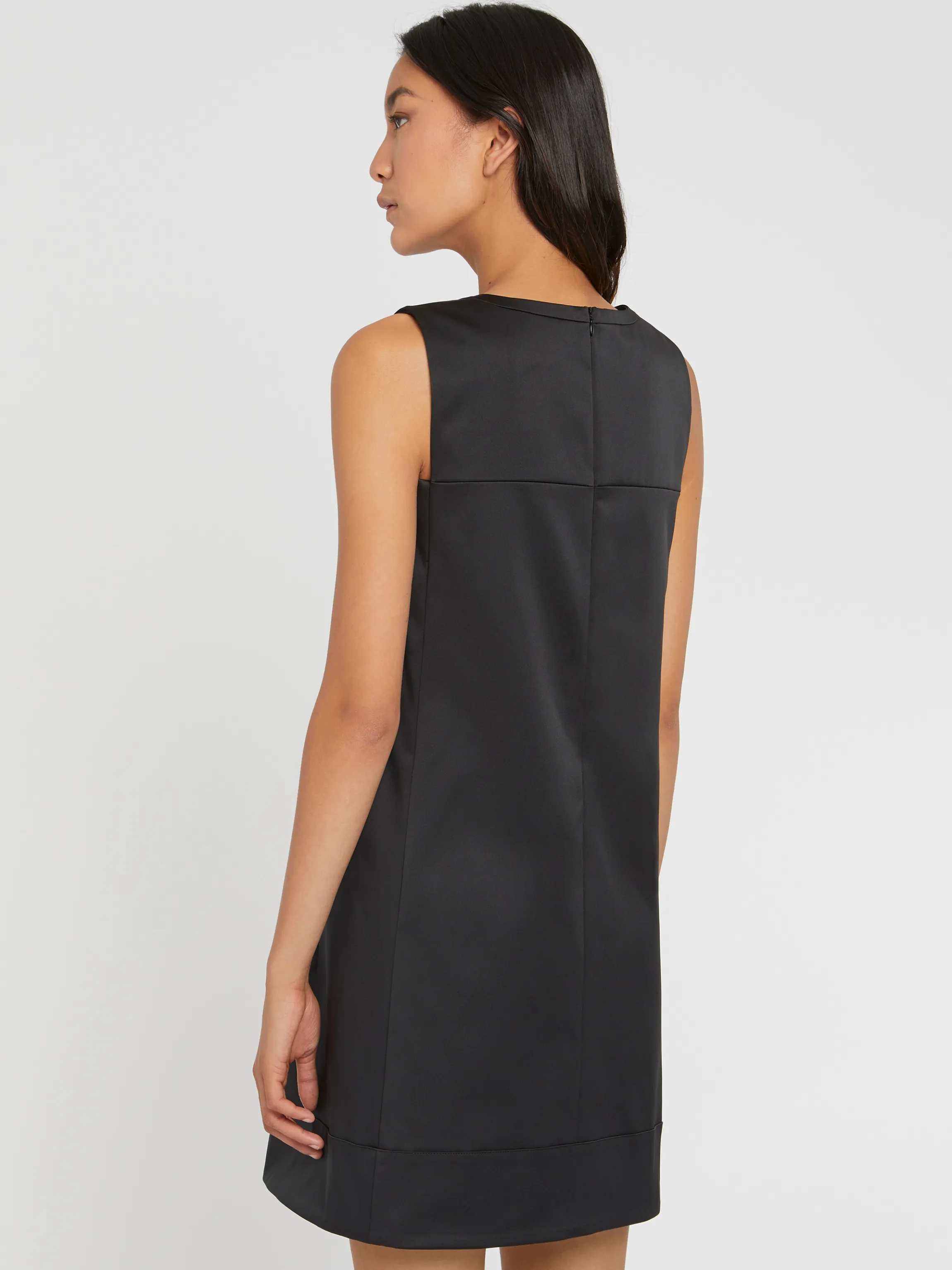 La Robe Courte Sans Manches Coupe Trapeze Arbore Un Decollete Graphique Qui Caracterise Le Modele Couture. La Confection En Satin Duchesse Doux Et Brillant Apporte Une Note Chic Et Elegante Au Modele. Ideal Pour Etre Elegante En Toute Simplicite. Fermeture Eclair Invisible Au Dos. La Longueur De La Robe A Partir De La Taille Est De 50 Cm.